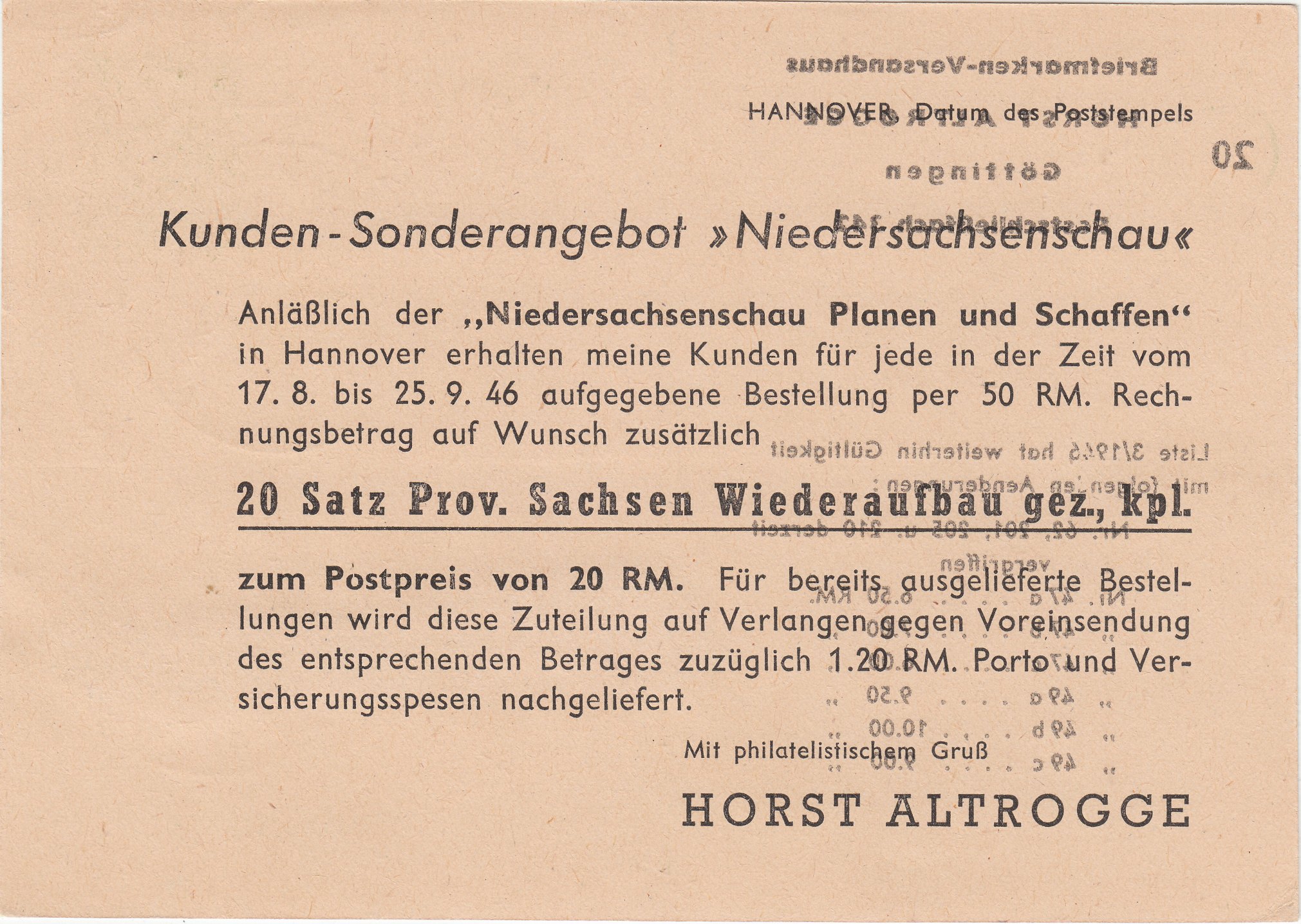 Ein Briefmarkenhändler in Göttingen versah solche Ganzsachen mit einem privaten Zudruck und nutzte diese am 17.08.1946, um seiner Kundschaft einen philatelistischen Gruß in Form des Sonderstempels zur Niedersachsenschau in Hannover zu senden. Da das Porto für eine Drucksache 6 Pf betrug wurde als Zusatzfrankatur zum eingedruckten Postwertzeichen der Ziffernserie der Wertstempel eines Postfreistempel der Wertstufe 1 Pf benutzt: