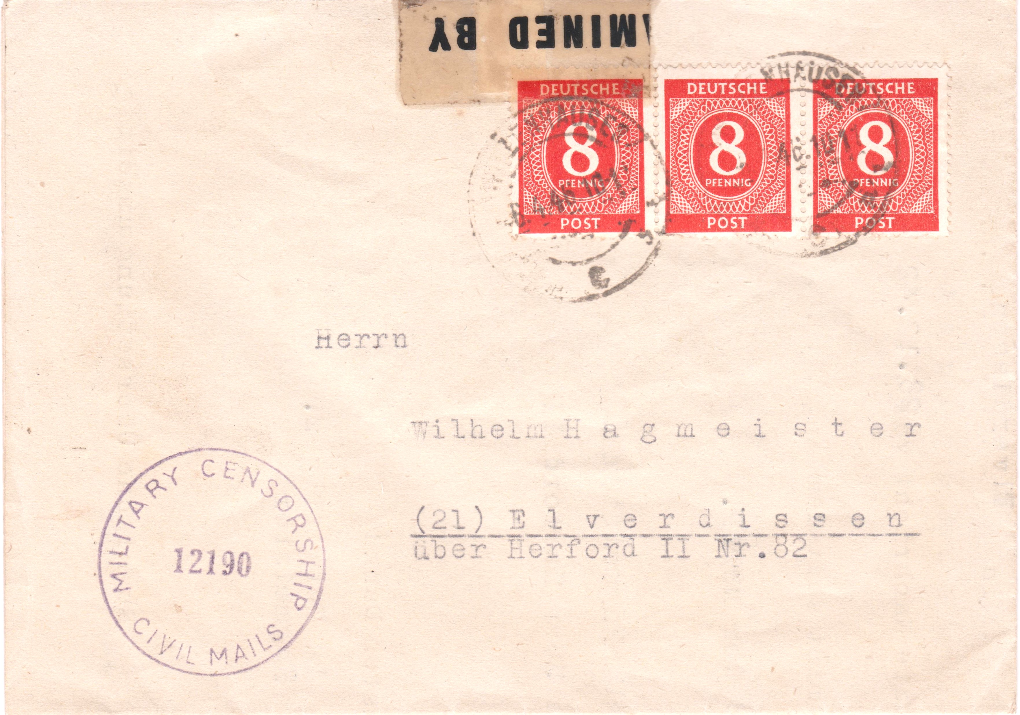 Fernbrief bis 20 g von WITZENHAUSEN nach Elverdissen, portogerecht frankiert mit 3 x 8 PFENNIG Ziffernserie: