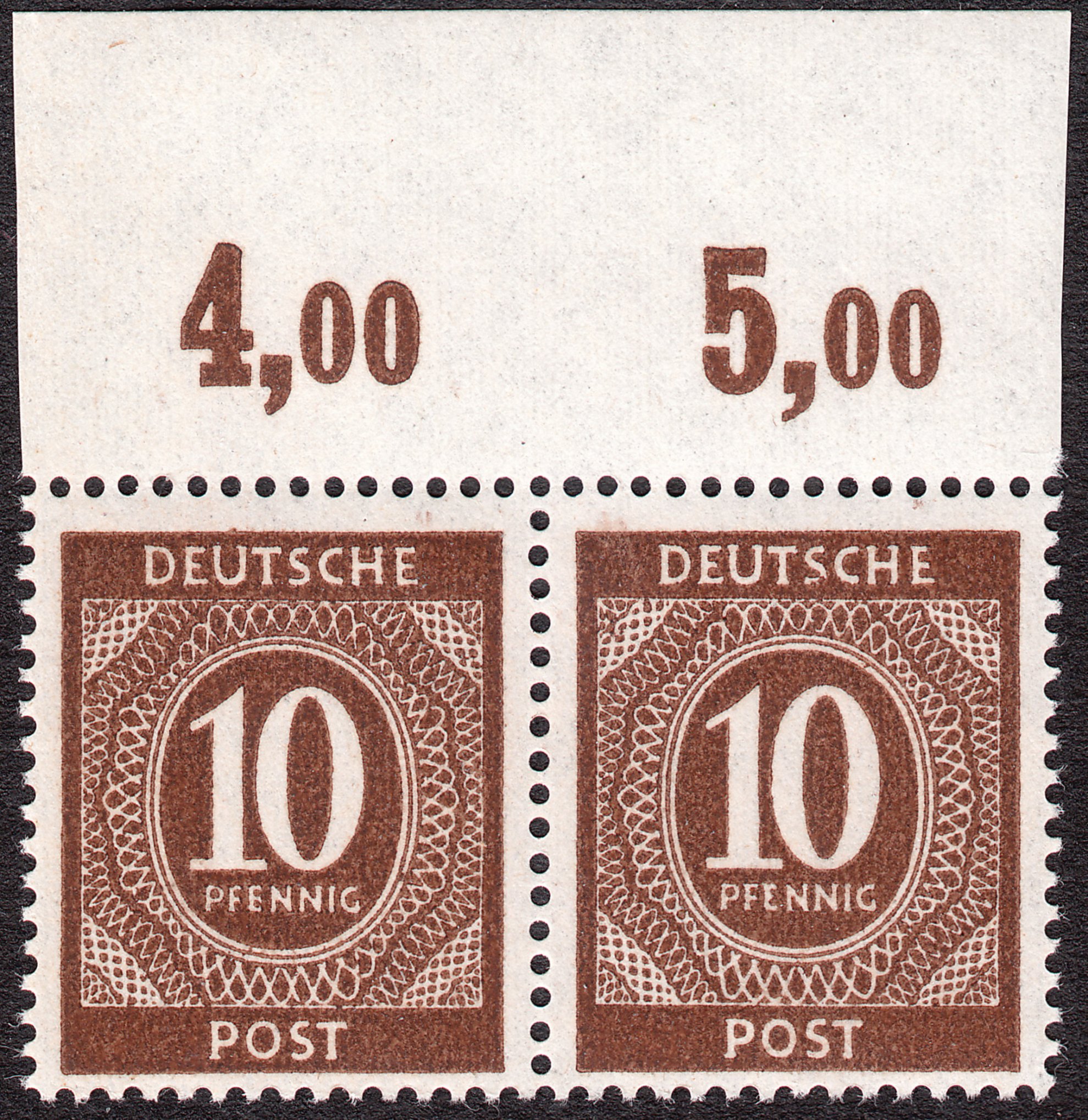 Beim 10 Pf Wert der Kontrollrat Ziffernserie gibt es bei den meisten Druckauflagen im Oberrand auf Feld 4 den Plattenfehler "Auslaufbogen des Kommas verkürzt":