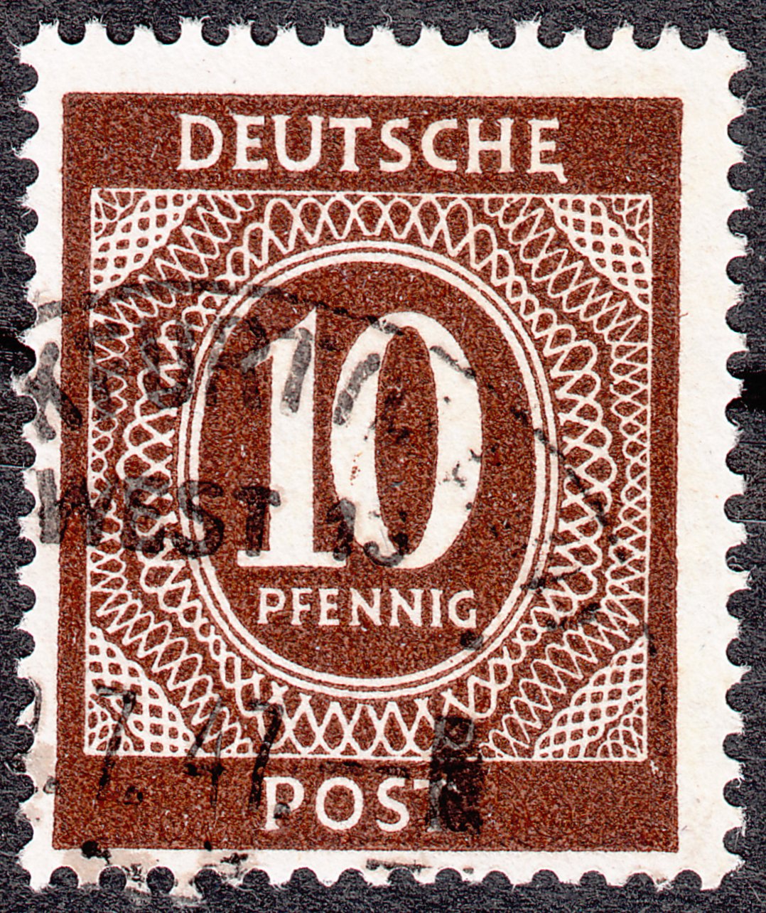Dieser gestempelte 10 Pf Wert zeigt einen Strich unten rechts am zweiten E von DEUTSCHE: