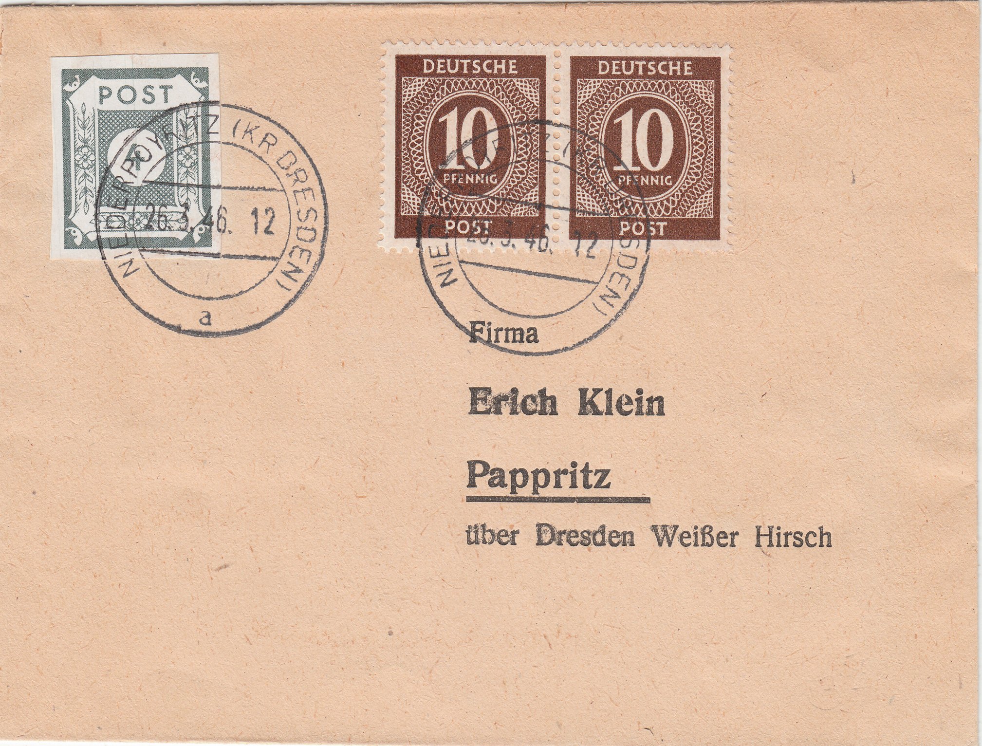 Paar der MiNr. 918 in Mischfrankatur mit einer Ausgabe Sowjetische Zone - Ostsachsen MiNr. 61 u am 26.03.1946 als erstem Monat der Gültigkeit dieser Portostufe portorichtig auf Fernbrief (24 Pf) von NIEDERPOYRITZ nach Pappritz: