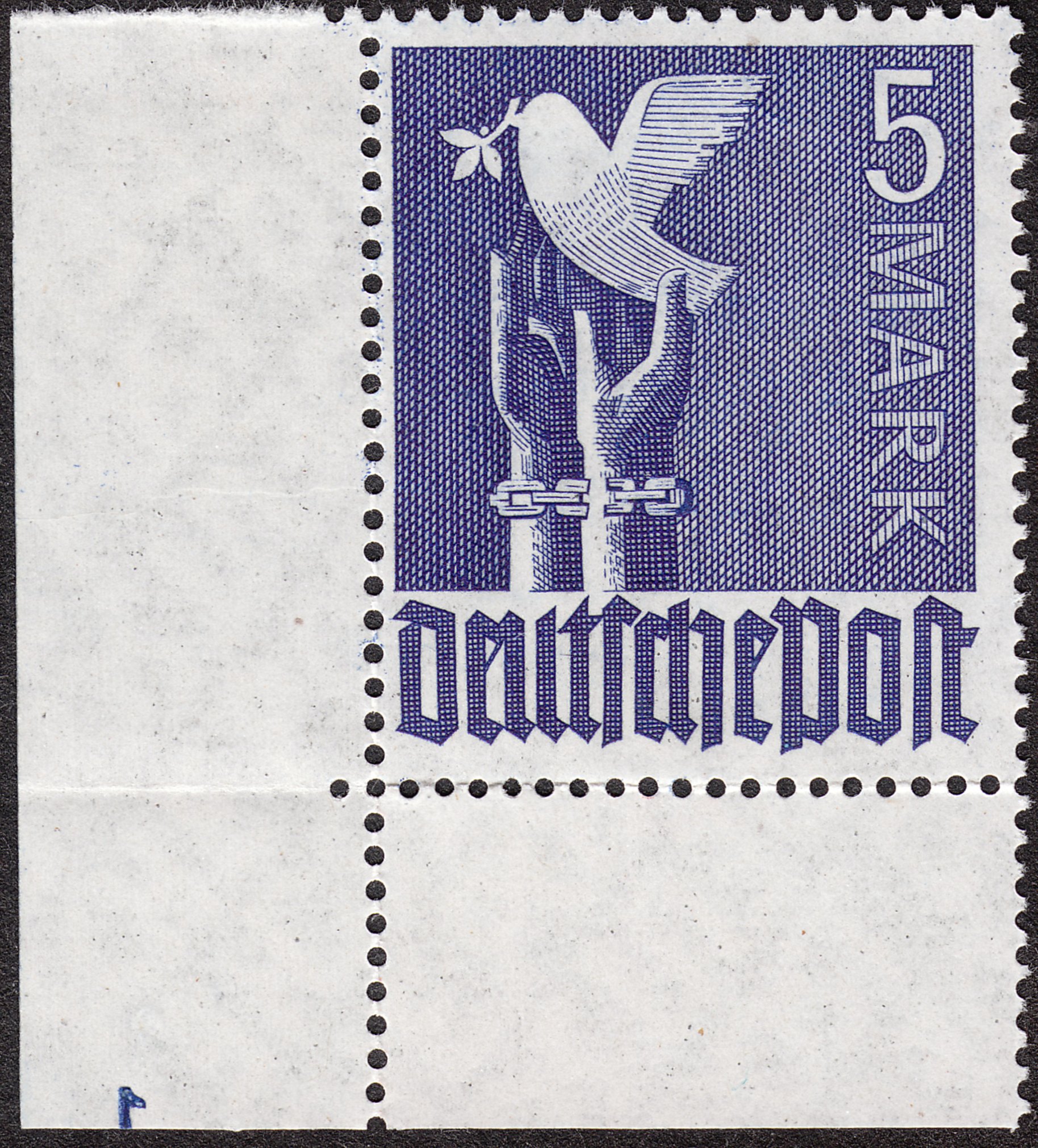 Links unten erkennt man die Plattennummer "1" in Markenfarbe seitenverkehrt gedruckt. Ein solches Exemplar hat immerhin einen zehnfachen Katalogwert von 35 MICHEL-€. Leider ist dieses Exemplar sowohl waagerecht als auch senkrecht entlang der Zähnung gefaltet, aber schön ist es dennoch!