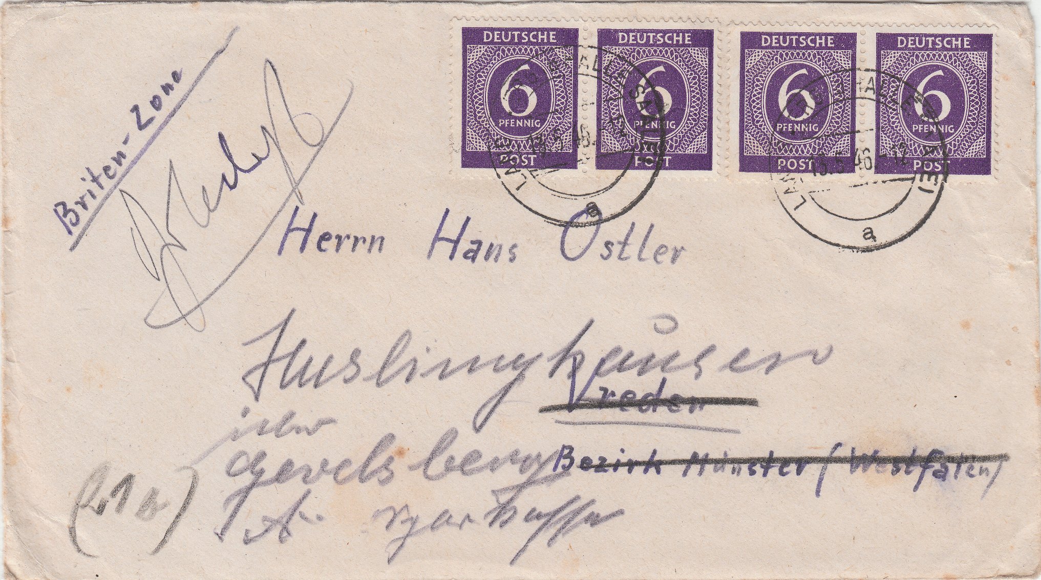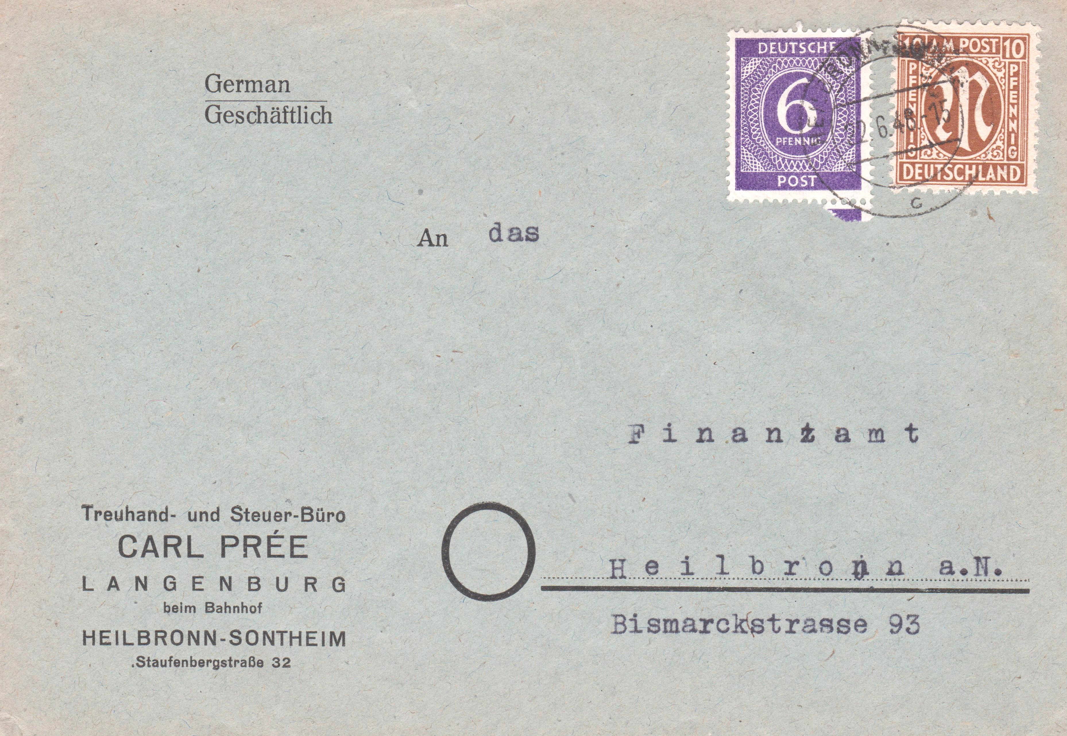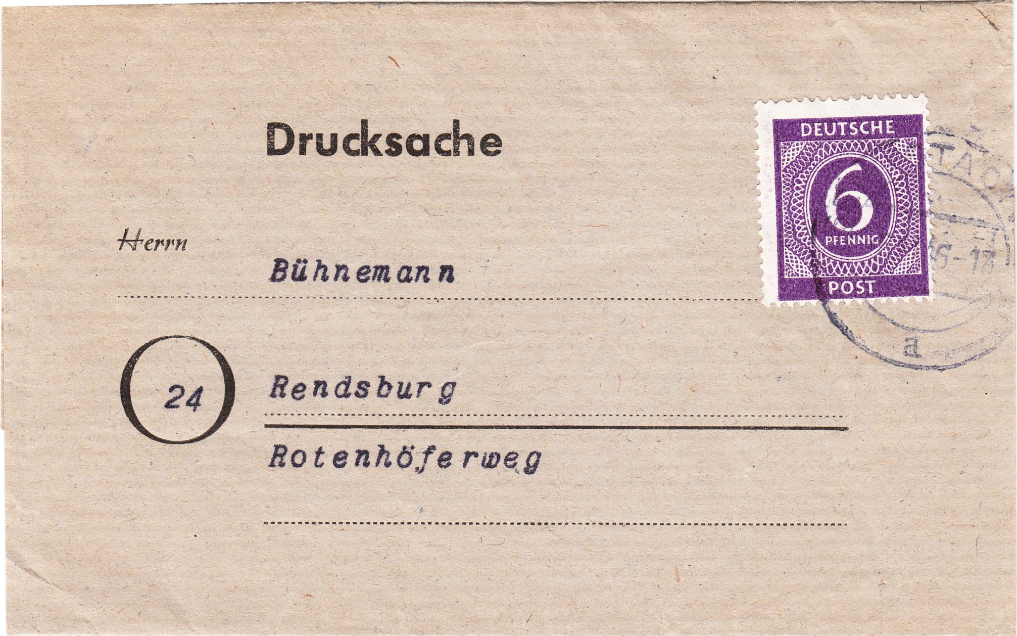 Ab dem 01.03.1946 verdoppelte sich das Porto, für eine Postkarte im Ortsverkehr auf 10 Pf, für eine Drucksache auf 6 Pf.