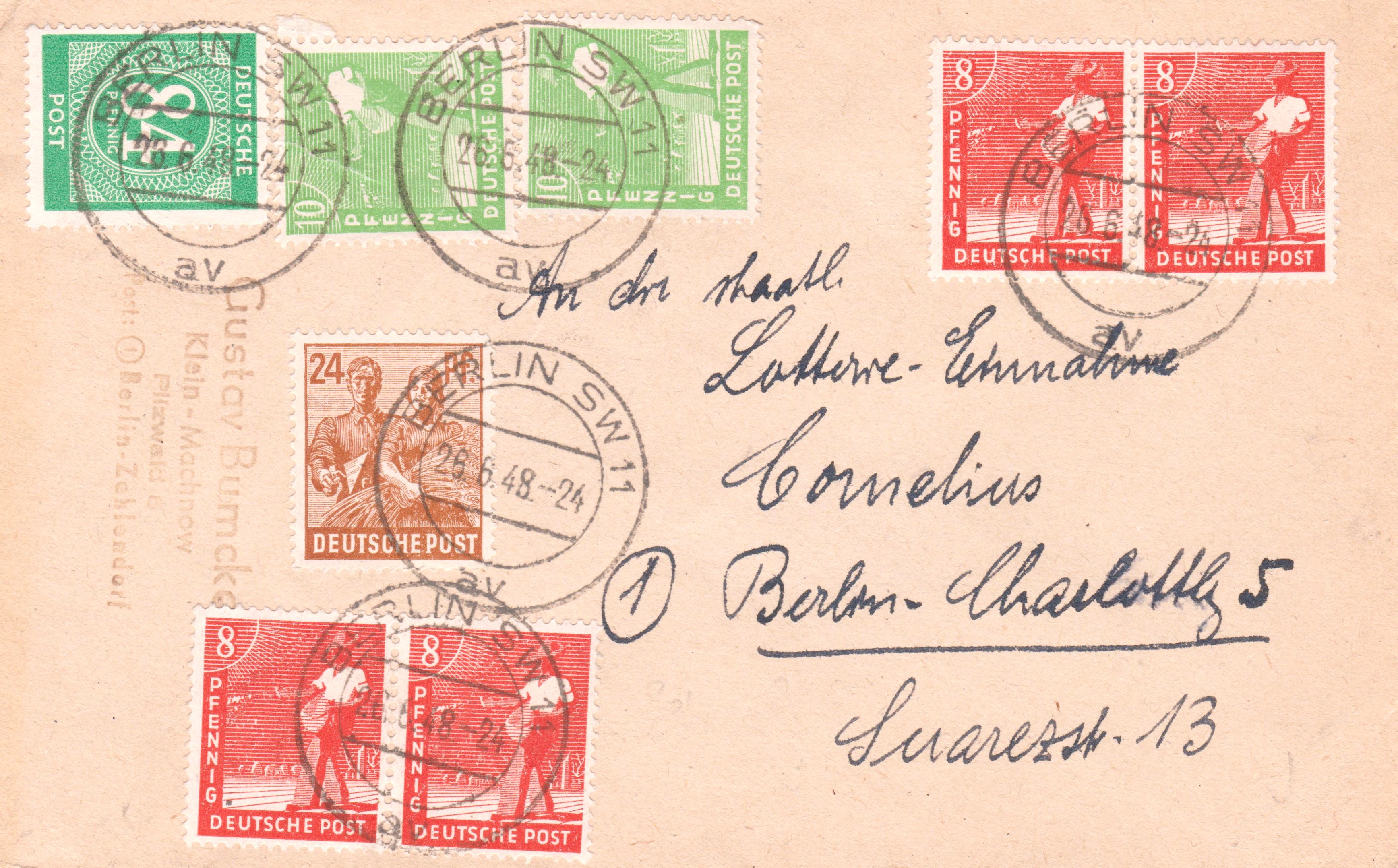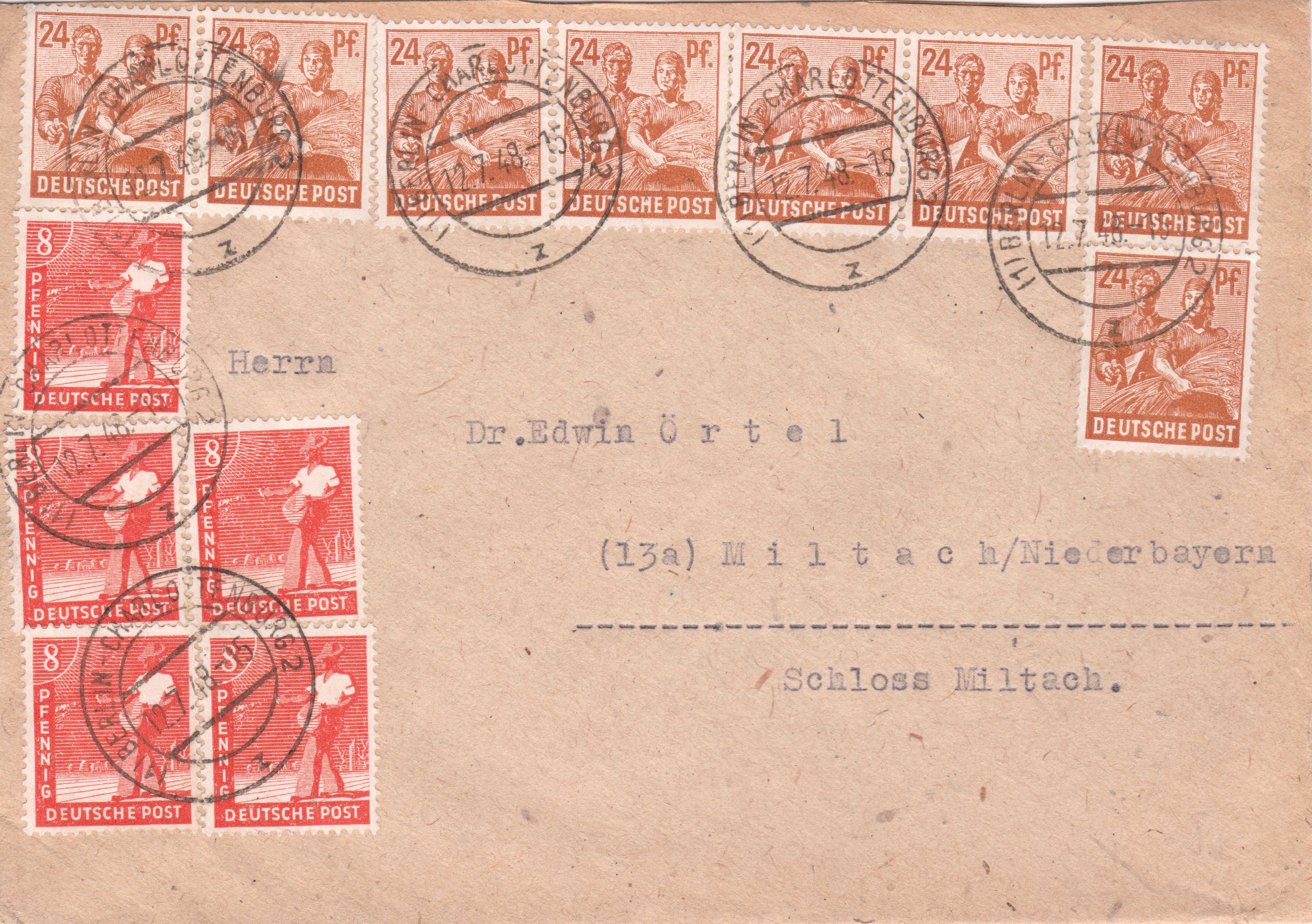 Mischfrankaur von 8x24 Pf sowie 5 x 8 Pf als Zehnfachfrankatur aufgegeben am 12.07.1948 in BERLIN: