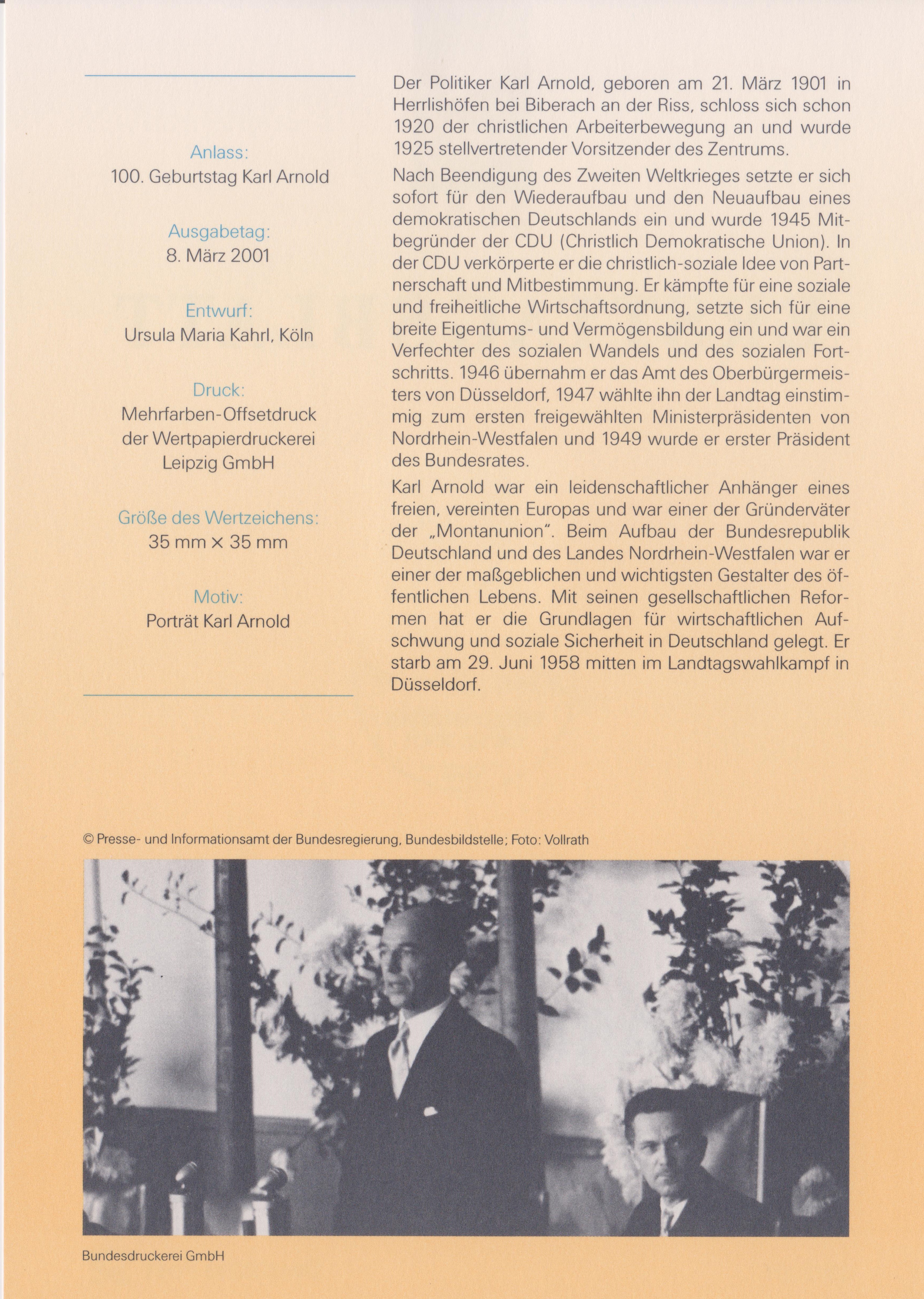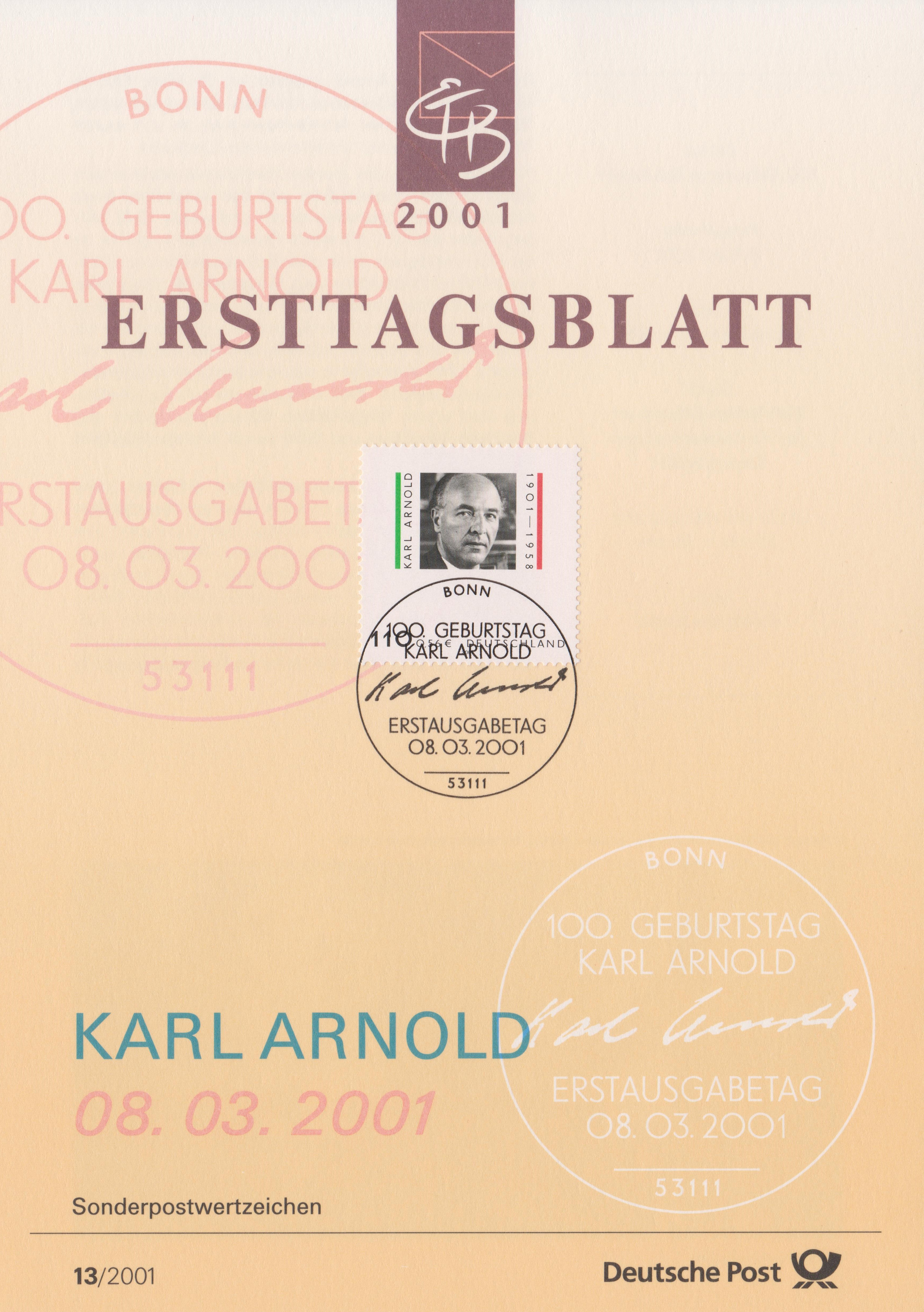 Anlässlich seines 100. Geburtstages erschien am 08.03.2001 eine Sondermarke, Bund MiNr. 2173, hier auf ETB 13/2001: