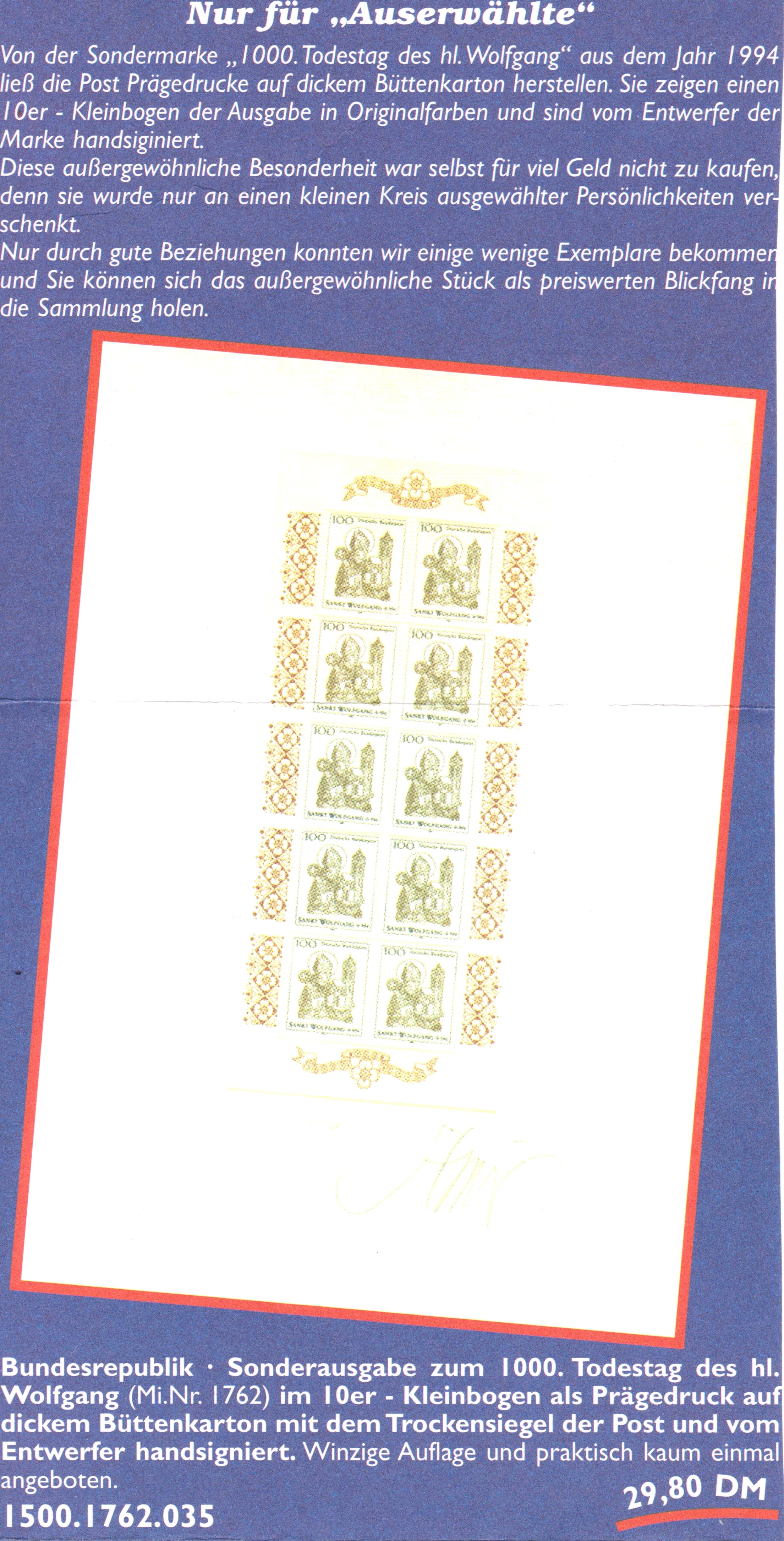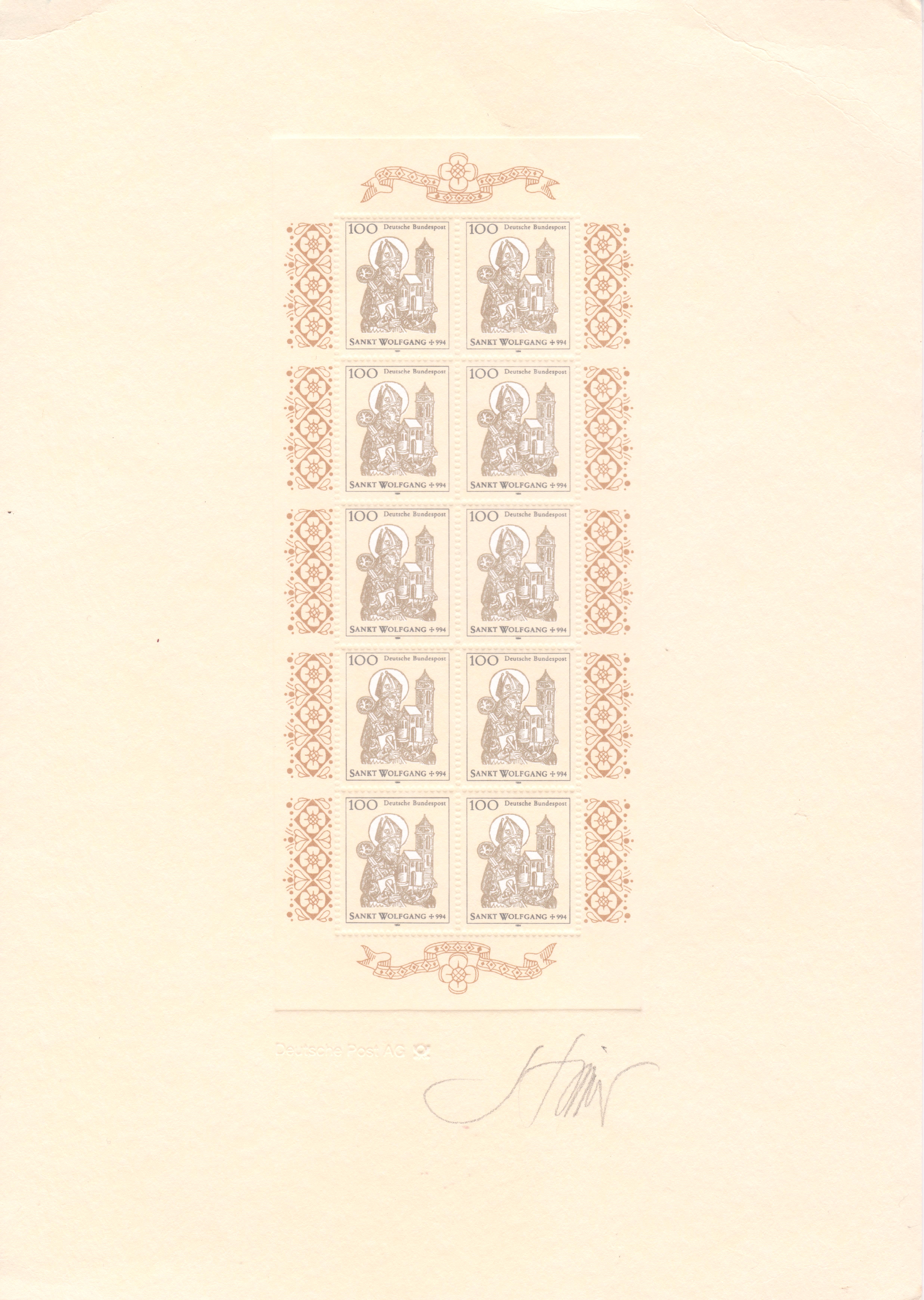 Bund MiNr. 1762 erschien am 13.10.1994 aus Anlass des 1000. Todestages des heiligen Wolfgang.