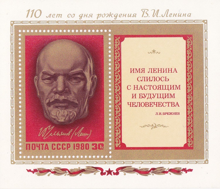 Aber auch 10 Jahre später wurde eine Marke zum Geburtstag herausgegeben. Hier sieht man einen Block aus dem Jahr 1980 aus der Sowjetunion.