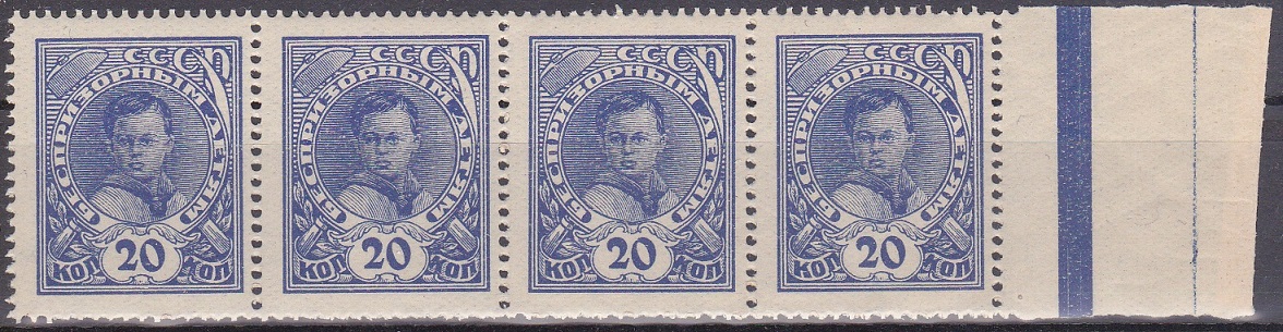 Dieser Viererstreifen ist eine schöne Rarität. Die jeweiligen Marken haben einen Wert zu 20 Kopeken und zeigen Lenin als Kind. Diese 1926 eingeplanten Briefmarken wurden offiziell nicht ausgegeben, entsprechend gering ist auch die Anzahl der Exemplare, die sich in Sammlerhand befindet.