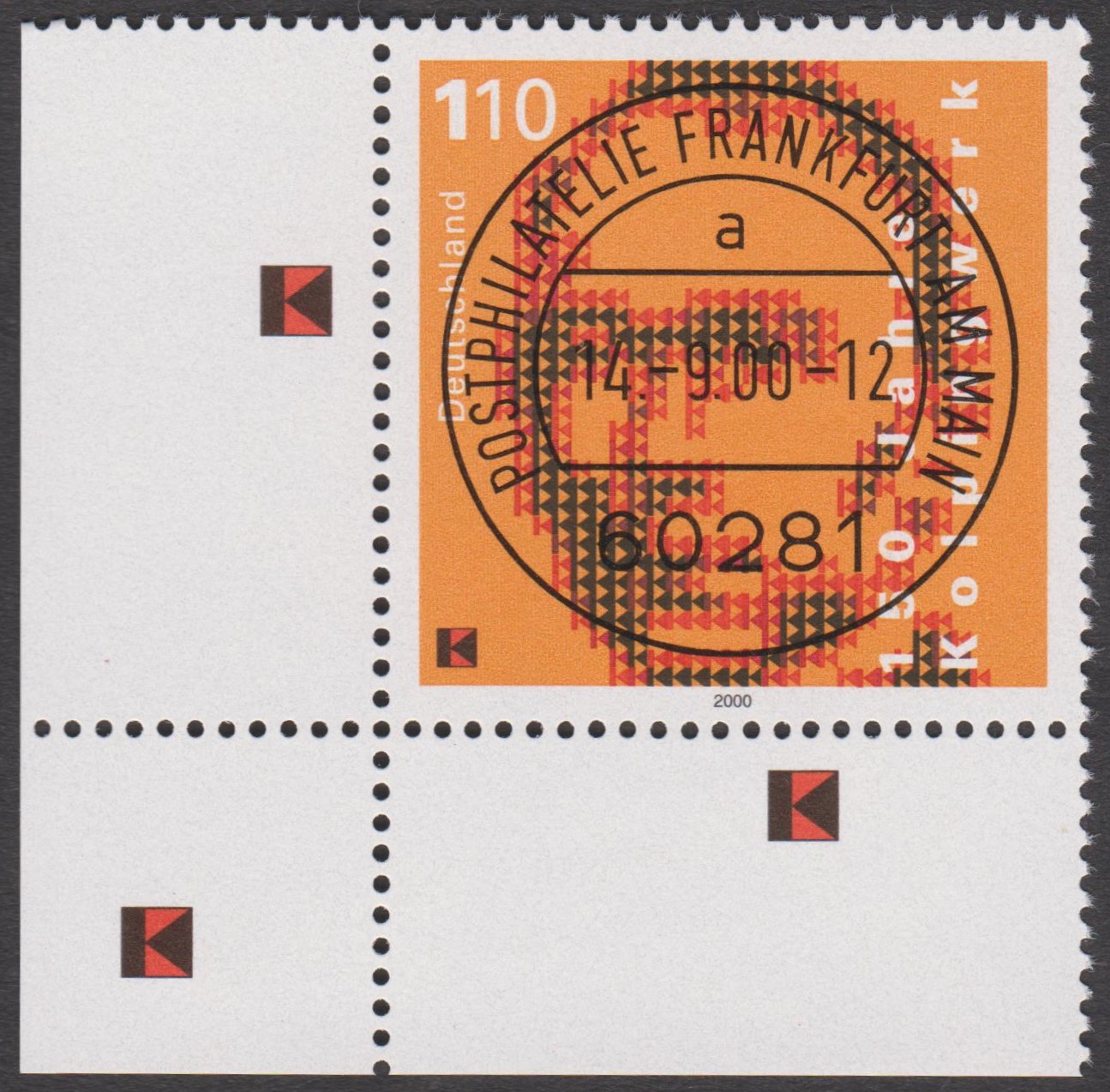Dieses Postwertzeichen gibt es mit dem auf Feld 10 bei einer Teilauflage vorkommenden Plattenfehler "Spitze des obersten roten Dreiecks rechts des Scheitels verdickt", katalogisiert als MiNr. 2135 I, hier auf dem ETB 38/2000: