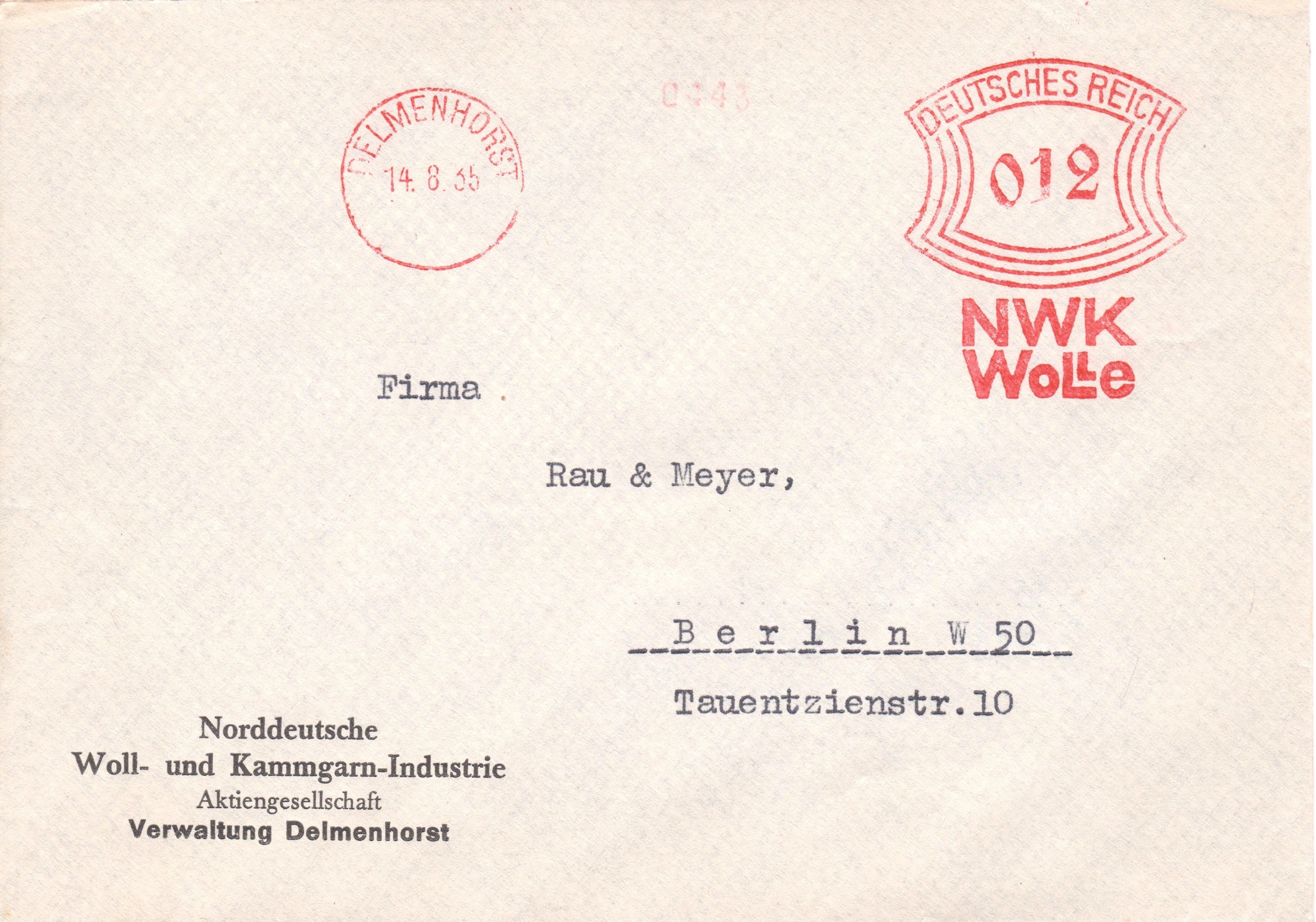 Brief, freigemacht per Absenderfreistempel der "NVK Wolle" (= Norddeutsche Woll- und Kammgarn-Industrie) in Delmenhorst: