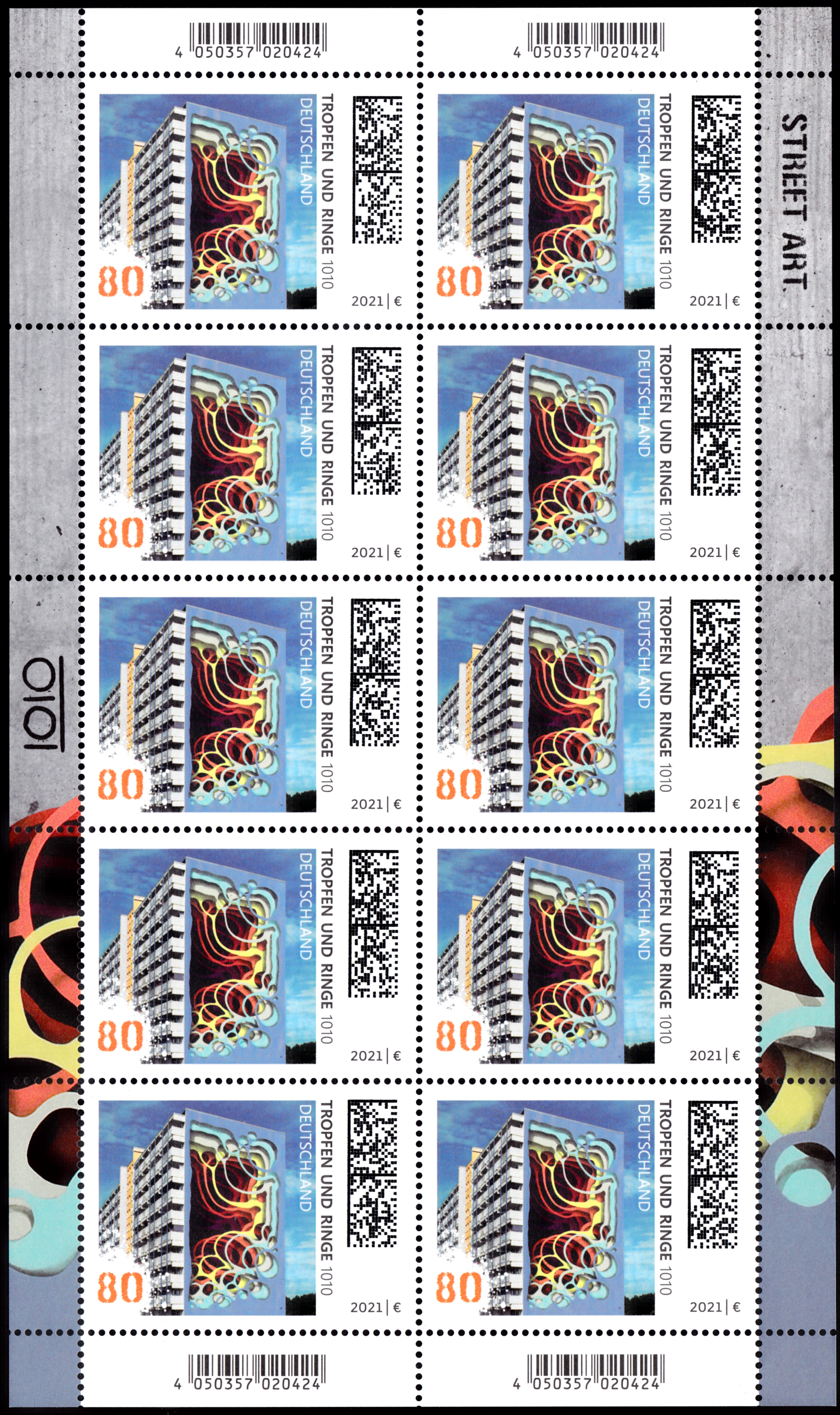 In der Serie "Streetart" ist diese Marke (MiNr 3633) mit der Abbildung der Wandmalerei "Tropfen und Ringe" von Graffiti-Künstler 1010 (geb. 1979) erschienen.