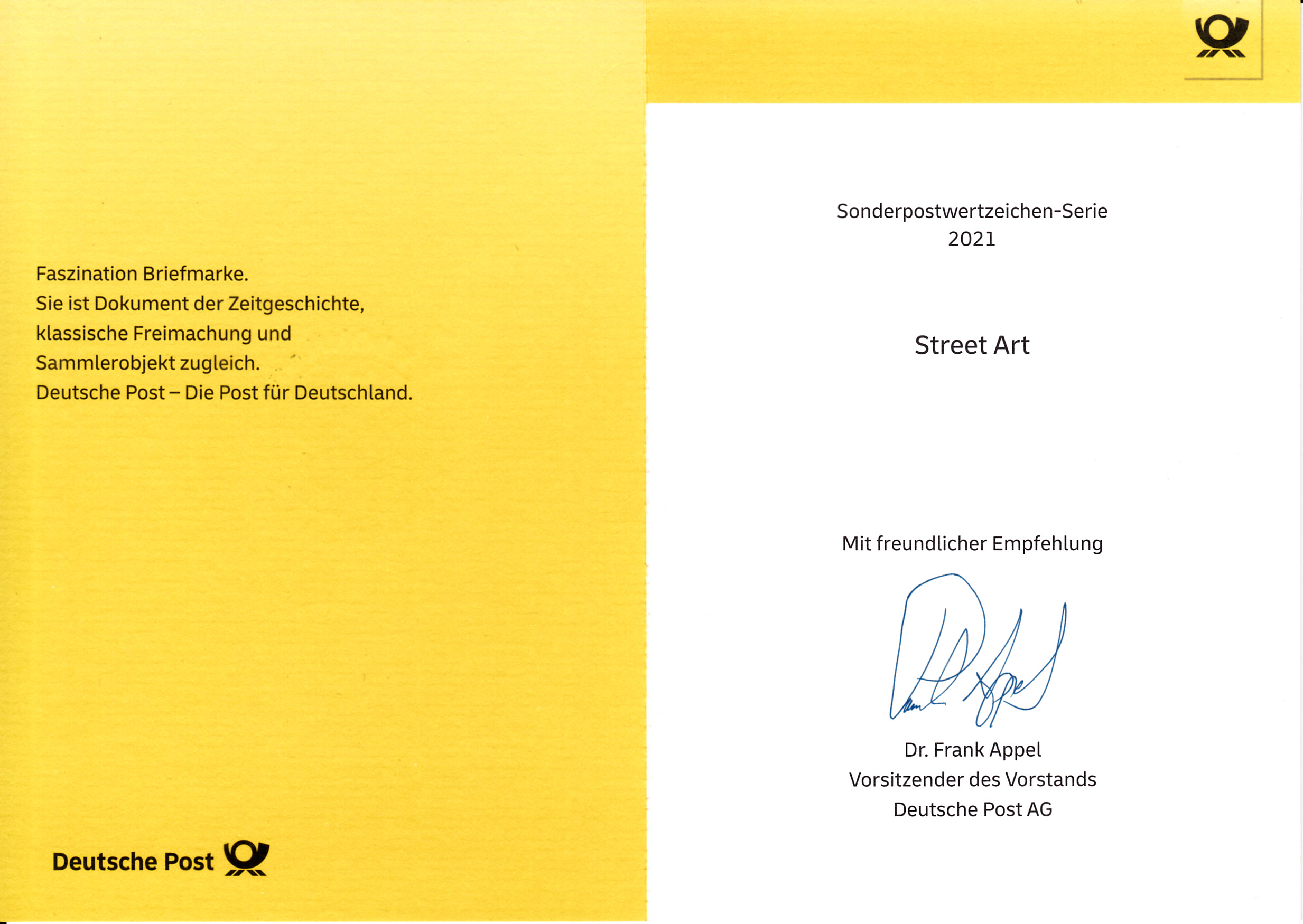 Ministerkarte des Bundesministers für Finanzen mit zwei Marken der Deutschen Post (MiNr 3633) der Serie "Street Art" mit dem Motiv "Wandmalerei „Tropfen und Ringe“" von Graffiti-Künstler 1010 (geb. 1979)" und den beiden Ersttagsonderstempel Bonn und Berlin. Wegen der Bundestagswahl am 26.9.2021 gab es am Tag der Ausgabe der Marken im Oktober nur einen "geschäftsführenden" Finanzminister. Die Ministerkarten tragen daher keine Unterschrift des Ministers.