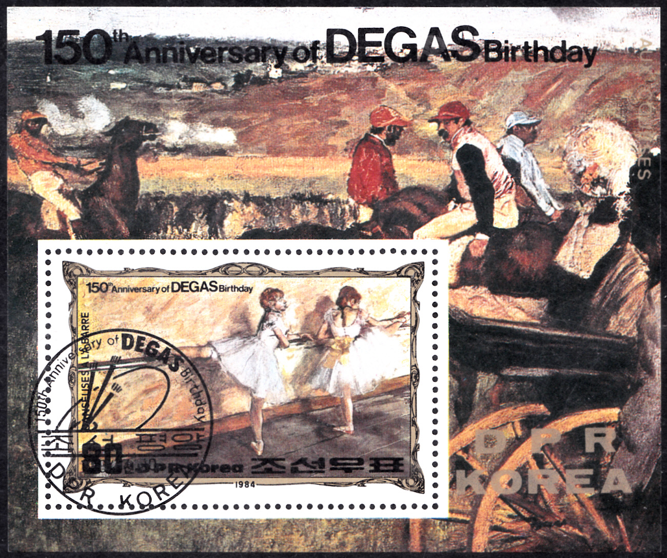Zum 150. Geburtstag von Edgar Degas ist in Nord-Korea unter anderem auch dieser Block (MiNr Block 178 mit Marke MiNr 2471) erschienen. Die Marke zeigt eines seiner vielen Gemälden mit Tänzerinnen. Auf dem Block ist auch noch teilweise das Gemälde "Kutsche auf dem Rennplatz" zu sehen.