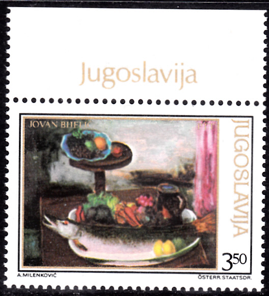 Auf dieser Marke aus Jugoslawien (MiNr 1911) wird das Gemälde "Stilleben mit Fisch" von Jovan Bijelić gezeigt.