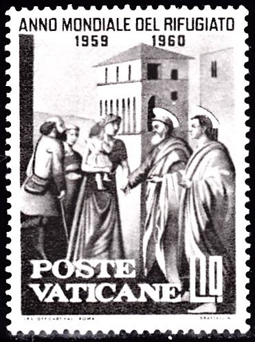 Zwei bildgleiche Marken sind im Vatikan in einer Serie zum Weltflüchtlingsjahr 1959/1960 erschienen. Sie zeigen das Gemälde "Der hl. Petrus als Almosenspender" von Masaccio.