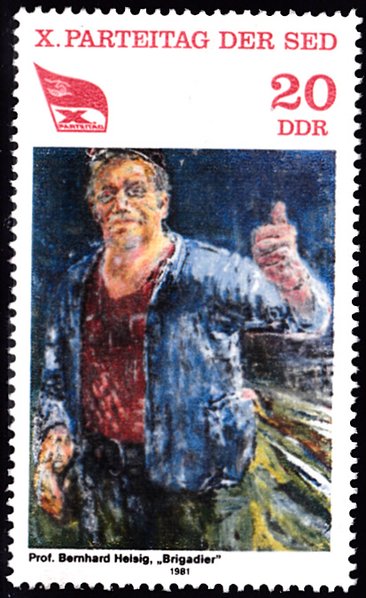 Auf einer Marke zum X. Parteitag der SED erschien diese Marker (MiNr 2596) mit dem Gemälde "Brigadier" von Bernhard Heisig.