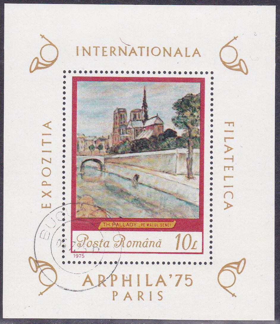 Zur Internationalen Briefmarkenausstellung ARPHILA ’75 in Paris ist in Rumänien dieser Block (MiNr Block 120 mit Marke MiNr 3265) erschienen. Die Marke zeigt das Gemälde "Am Ufer der Seine" von Theodor Pallady.