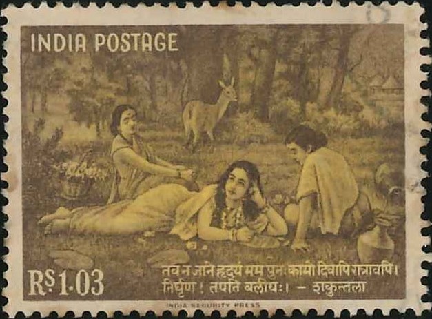 Auf einer Marke aus Indien (MiNr 314) sehen wir "Schakuntala" mit ihren Gespielinnen auf einer Waldlichtung beim Briefschreiben und eine Gazelle im Hintergrund, eine Szene aus dem Epos "Schakuntala" von Kalidasa (indischer Dichter, der wahrscheinlich Ende 4./Anfang 5. Jahrhundert zur Zeit des Guptareichs lebte) nach einem Gemälde von Raja Ravi Varma.