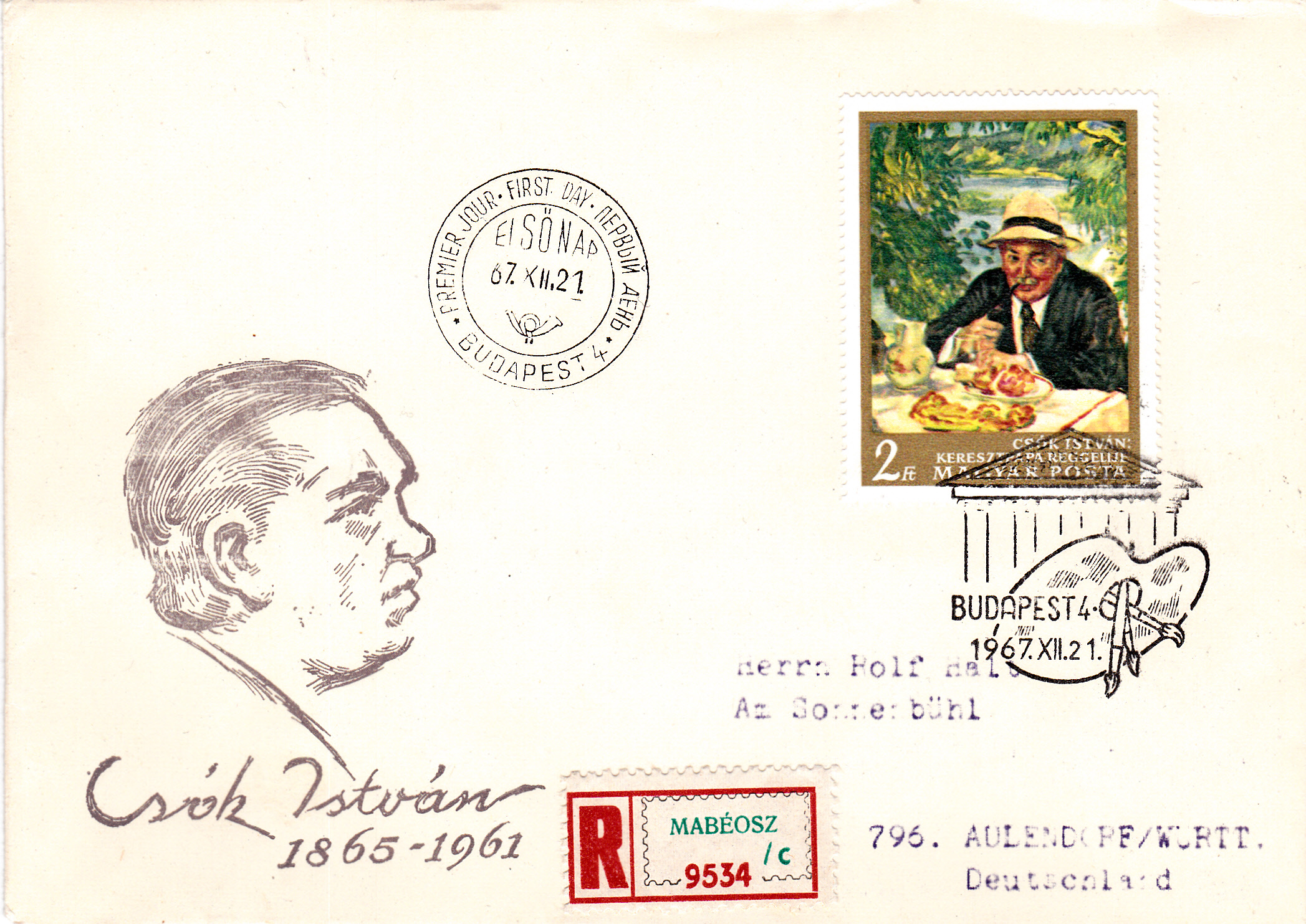 In der Serie "Gemälde der Nationalgalerie Budapest Meister des 20. Jahrhunderts" erschien auch diese Marke (MiNr 2374 A) mit seinem Werk "Frühstück des Paten", hier auf einem per Einschreiben gelaufenem Erstagsbrief. Rückseitig wurde eine weitere Marke verklebt.
