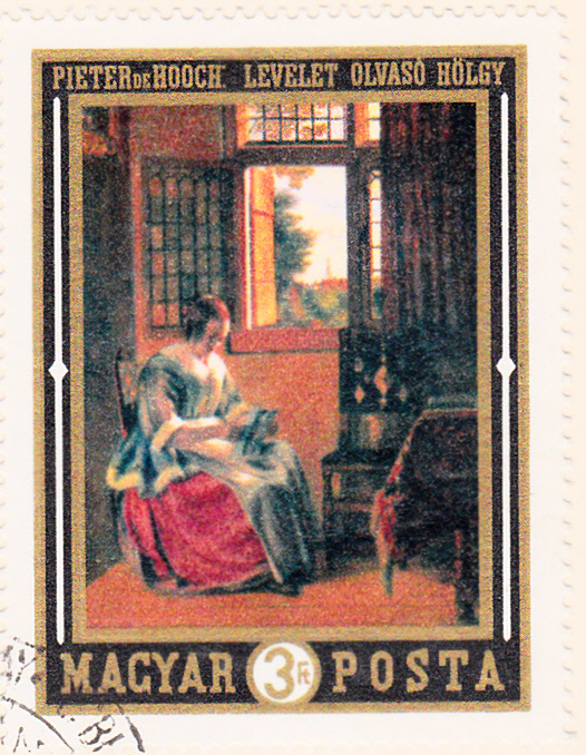 In einer Serie "Gemälde holländischer Meister" ist in Ungarn auch eine Marke (MiNr 2559 A) mit dem Gemälde "Lesende" von Pieter de Hooch erschienen. Hier wurde eine Marke auf einem Brief mit Einschreiben nach Deutschland zur Frankatur verwendet. Die Marke gibt es auch geschnitten. Rückseitig wurden zwei Marken zur Vervollständigung des Portos verklebt.