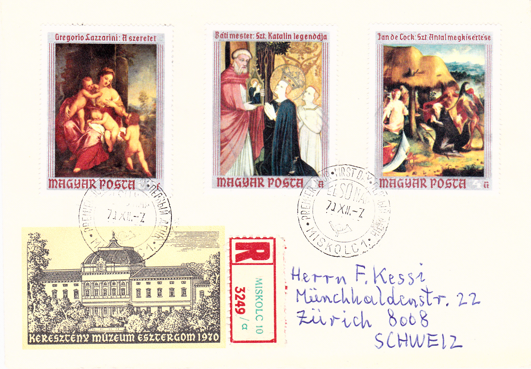 In einer Serie "Gemälde" ist in Ungarn auch eine Marke (MiNr 2634 A) mit dem Gemälde "Die liebe Caritas" von Gregorio Lazzarini erschienen. Hier wurde eine Marke auf einem Brief mit Einschreiben in die Schweiz zur Frankatur verwendet. Die Marke gibt es auch geschnitten. Rückseitig wurden drei Marken zur Vervollständigung des Portos verklebt. Ebenfalls auf der Rückseite ist ein Ankunftsstempel aus Zürich zu sehen.