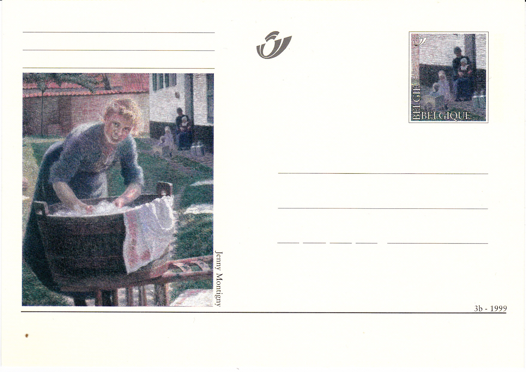Auf dieser Ganzsachenpostkarte wird auf der linken Seite ein Werk von Jenny Montigny gezeigt und ein Ausschnitt daraus wird im Wertstempel als Motiv verwendet.