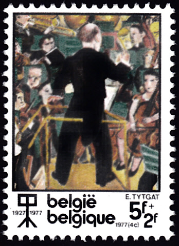 Zum Jubiläum "50 Jahre Philharmonische Vereinigung von Brüssel" ist diese Marke (MiNr 1897) mit einem Detail aus dem Gemälde "Die große musikalische Pyramide" (Detail) von Edgard Tytgat in einer Serie "Kultur" erschienen.