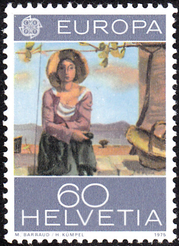 Die Europamarke 1975 zu 60 Rappen aus der Schweiz (MiNr 1052) zeigt das Gemälde "L´effeuilleuse" von Maurice Barraud.