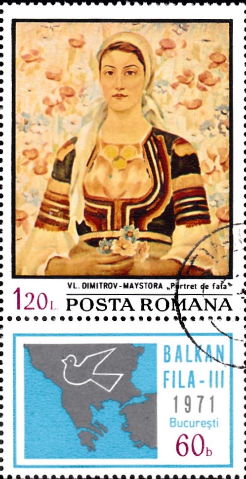 In Rumänien ist zur Briefmarkenausstellung BALKANFILA – III in Bukarest auch eine Marke (MiNr 2932) mit einem Porträt eines Mädchens von Wladimir Dimitrow-Maistora erschienen. Sie wurde mit fünf weiteren Marken jeweils mit senkrecht anhängendem Zierfeld zusammen in einem Kleinbogen gedruckt. Hier zeige ich die Marke mit Zierfeld.