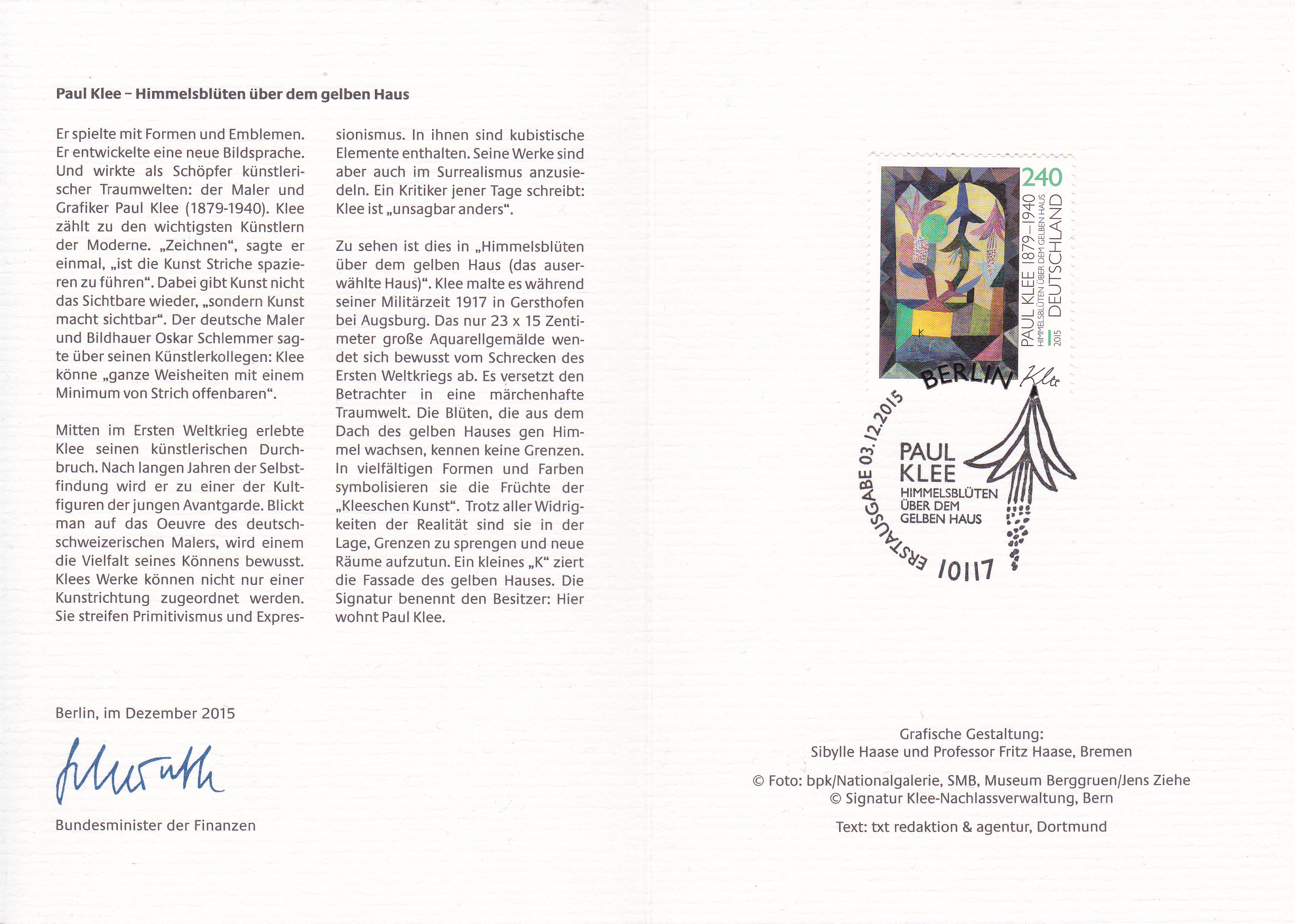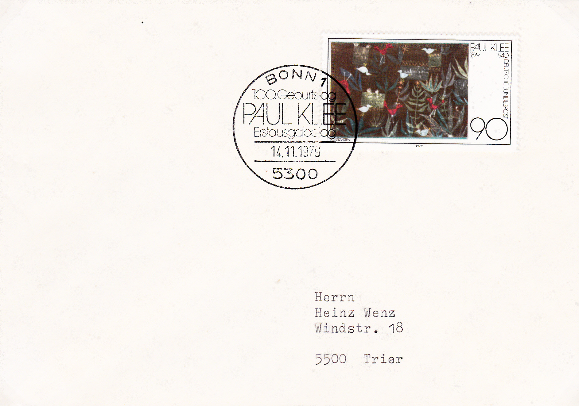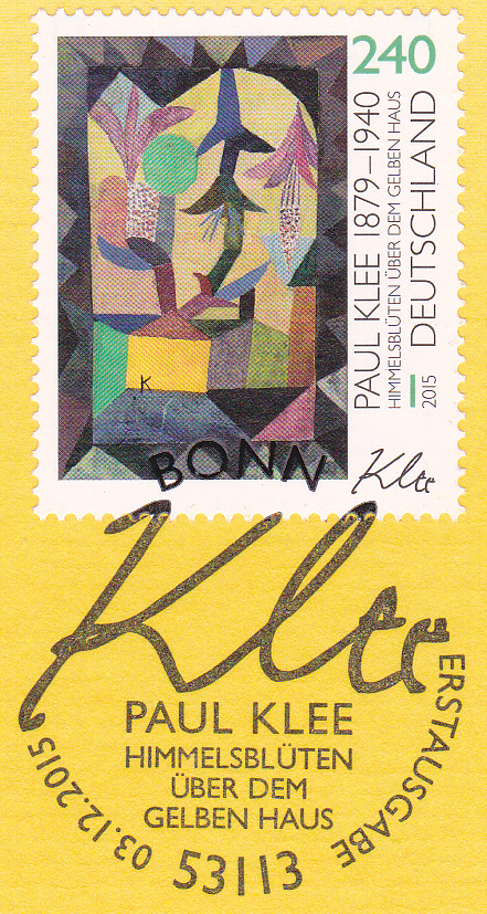 Zum 100. Geburtstag von Paul Klee wurde bei der Deutschen Bundespost eine Sondermarke (MiNr 1029) mit seinem Aquarell "Vogelgarten" herausgegeben.
