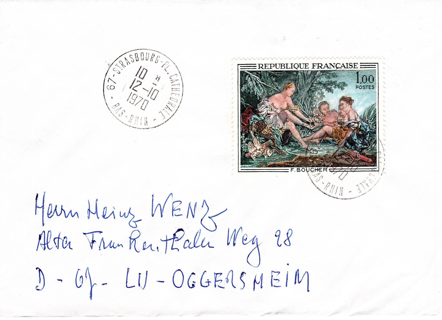 1970 erschien in Frankreich eine Marke (MiNr 1725) mit seinem Gemälde "Dianas Rückkehr von der Jagd". Hier ein Exemplar auf einem Brief von Straßburg nach Ludwigshafen.
