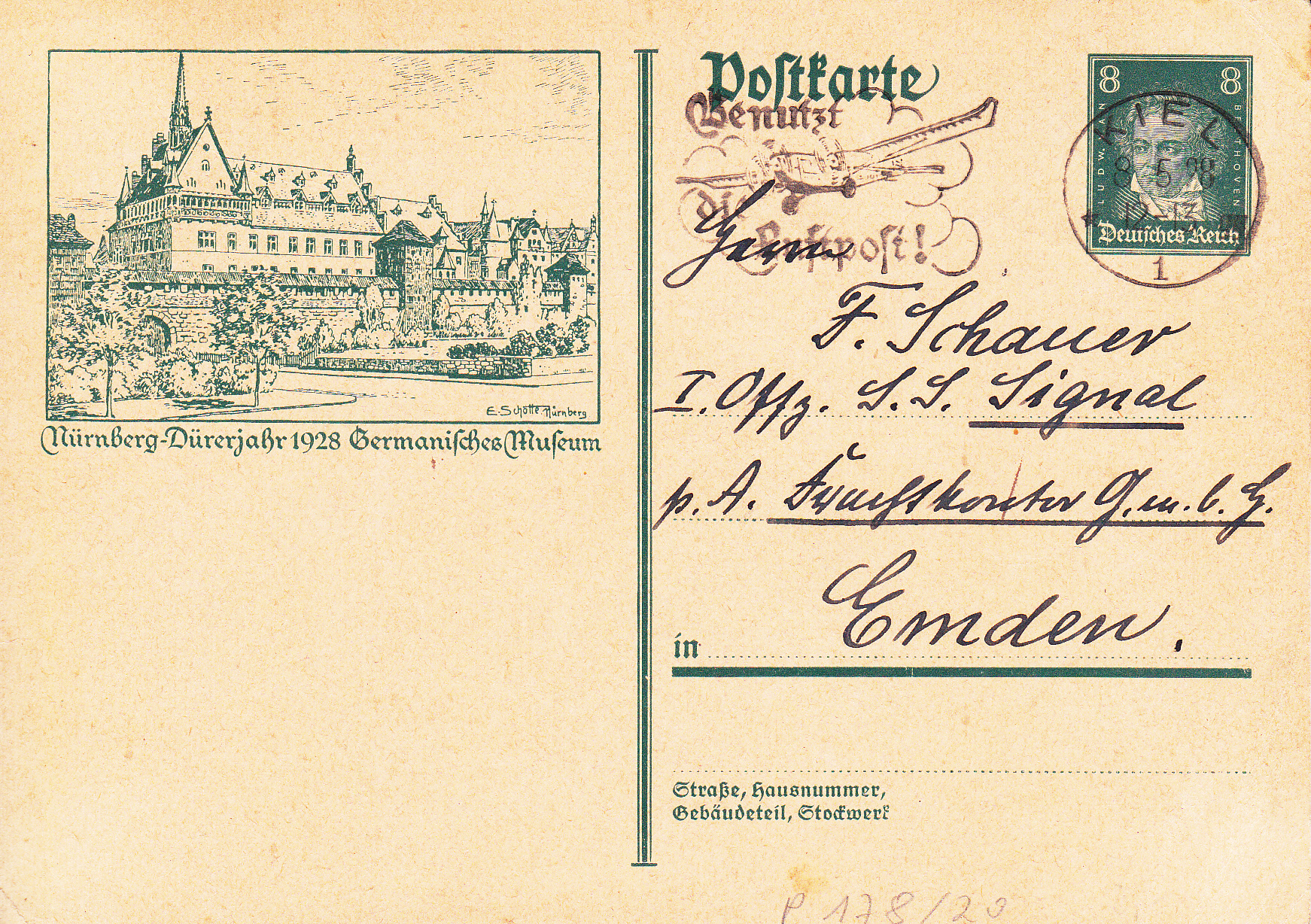 Auf der Bildpostkarte MiNr P 178/20 ist das Germanische Museum in Nürnberg abgebildet. Im Text erfolgt ein Hinweis auf das "Dürerjahr 1928".