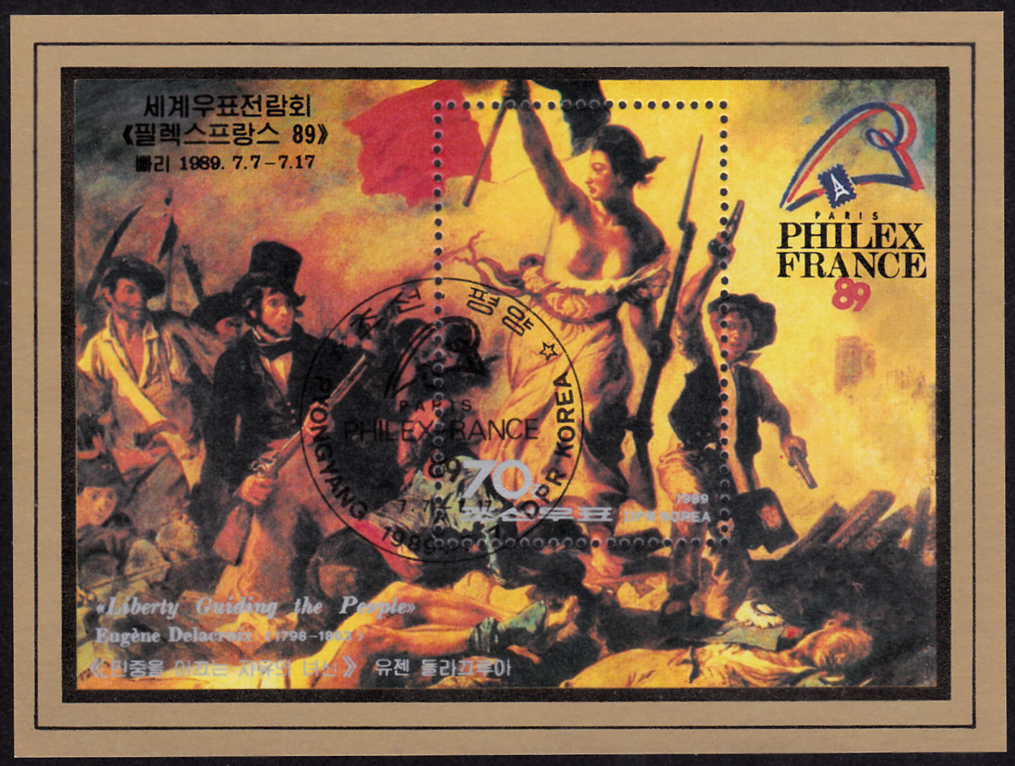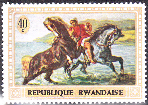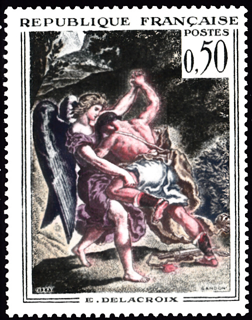 Aus Frankreich kommt eine Marke (MiNr 1426) mit einem Detail aus dem Wandgemälde für Saint-Sulpice in Paris "Der Kampf Jakobs mit dem Engel".