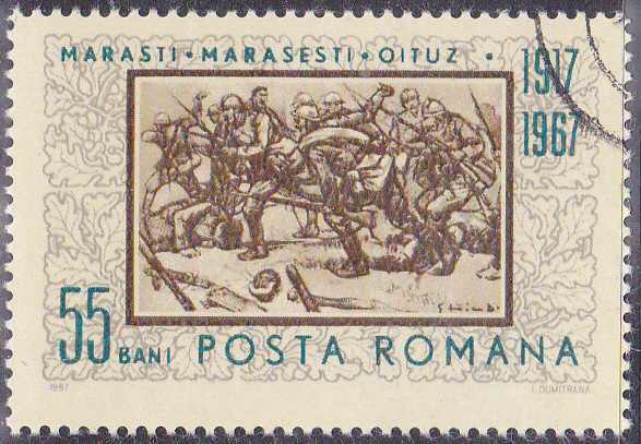 Diese Marke aus Rumänien (MiNr 2606) zum Jahrestag der Kämpfe bei Mărăști, Mărășești und Oituz bildet den "Angriff von Mărășești nach einem Gemälde von Ion Stoica Dumitrescu ab.