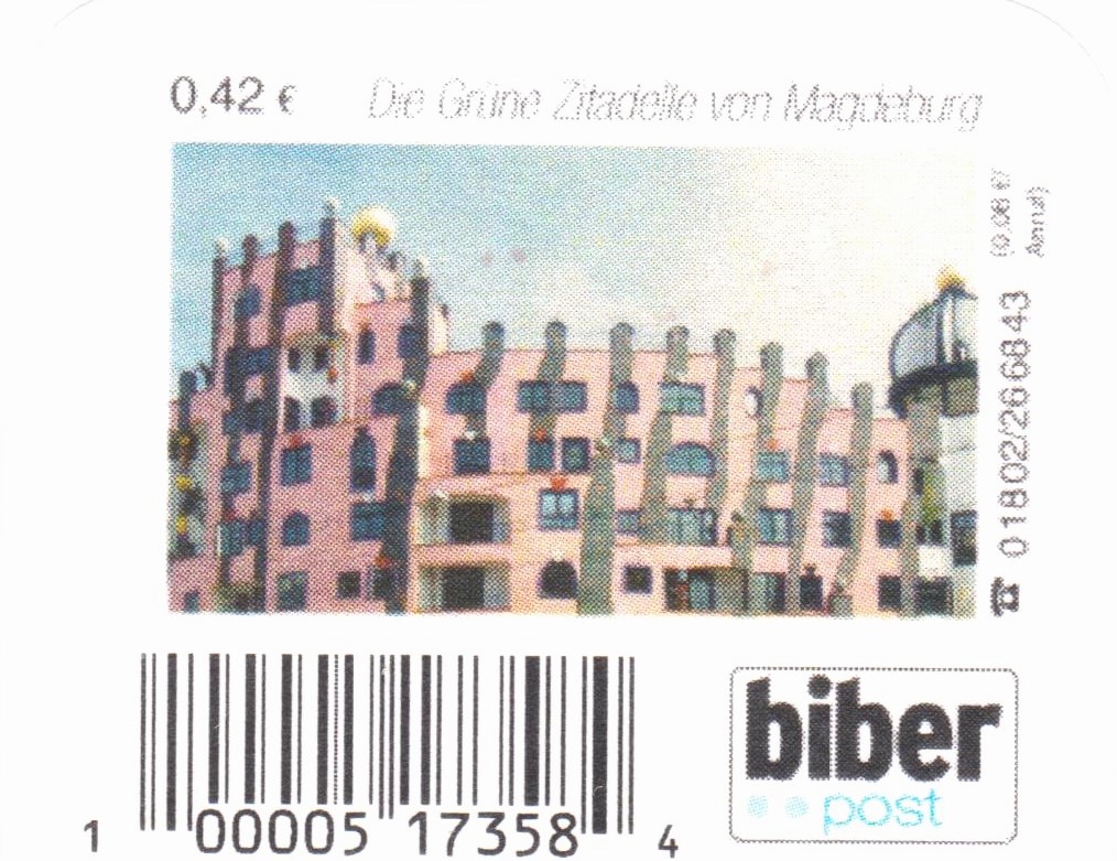 Diese von biber post ausgegebene Marke zeigt als Motiv "Die Grüne Zitadelle von Magdeburg":