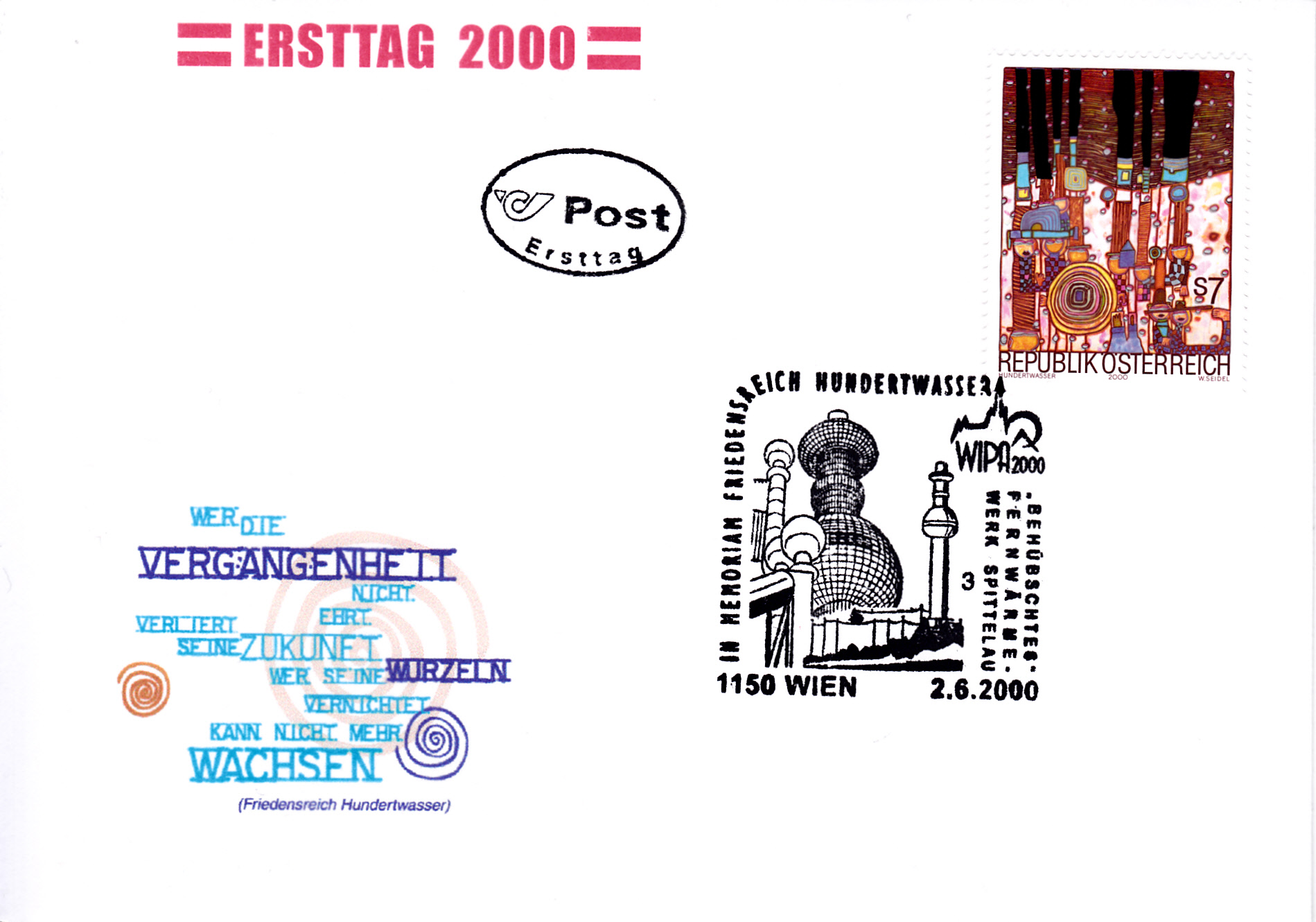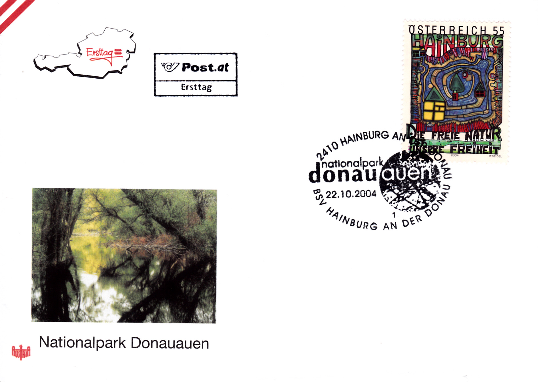 FDC mit der bereits hier gezeigten Marke "Nationalpark Donau-Auen" (MiNr 2502) mit dem Plakat anlässlich der Donau-Au-Besetzung in Hainburg von Friedensreich Hundertwasser und dem dazu passenden Sonderstempel aus Hainburg.