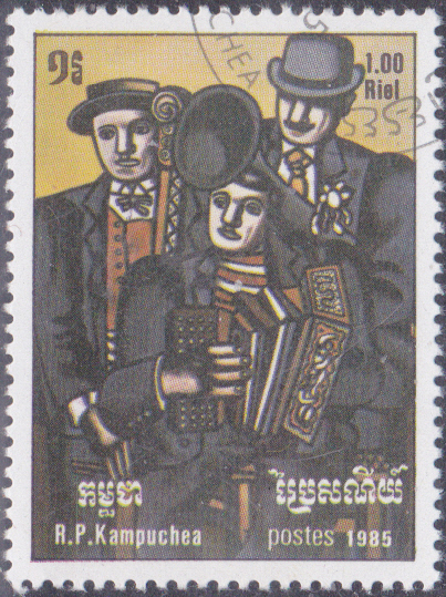 Zum Internationalen Jahr der Musik ist 1985 in Kambodscha diese Marke (MiNr 683) mit dem Gemälde "Drei Musikanten" von Fernand Léger erschienen.