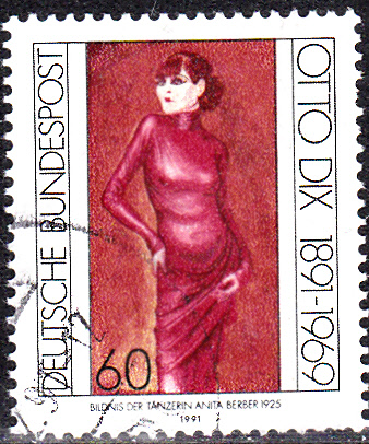 Zu der gleichen Ausgabe zum 100. Geburtstag von Otto Dix gehört noch diese Marke (MiNr 1572) mit der Abbildung seines Gemäldes "Bildnis der Tänzerin Anita Berber" aus dem Jahre 1925.