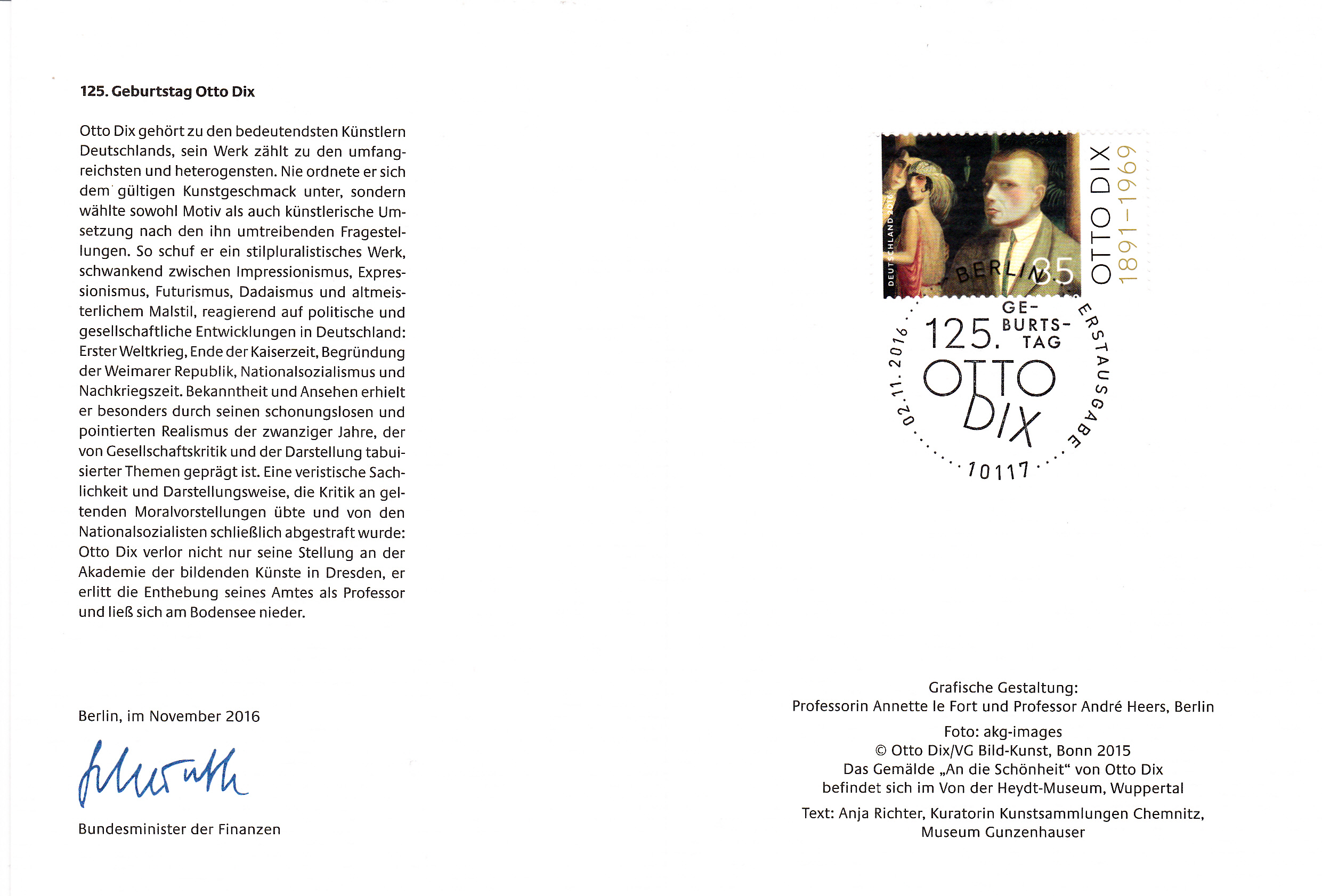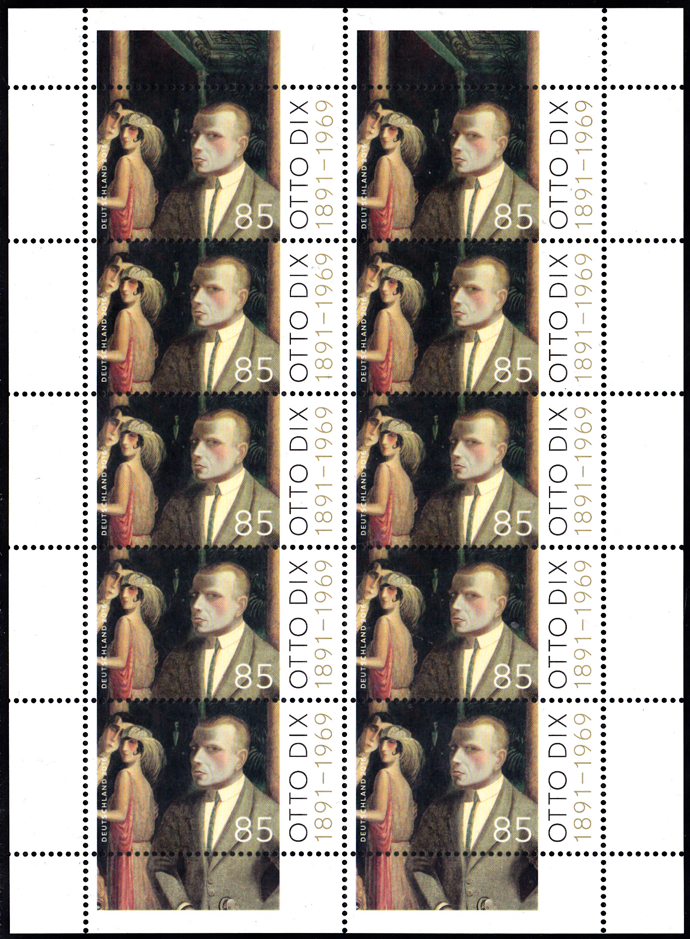 Zum 125. Geburtstag von Otto Dix erschien bei der Deutschen Post AG eine weitere Marke (MiNr 3267). Im Markenbild wird ein Detail des Gemäldes "An die Schönheit" von Otto Dix gezeigt.