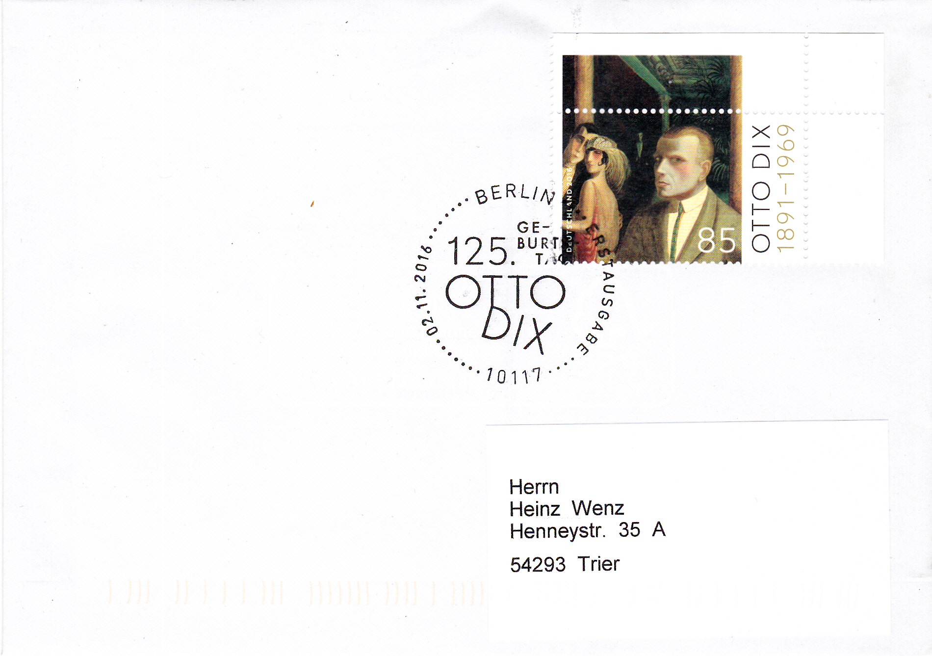 Ersttagsbrief mit der Marke zum 125. Geburtstag von Otto Dix und den Ersttagsonderstempel Berlin.