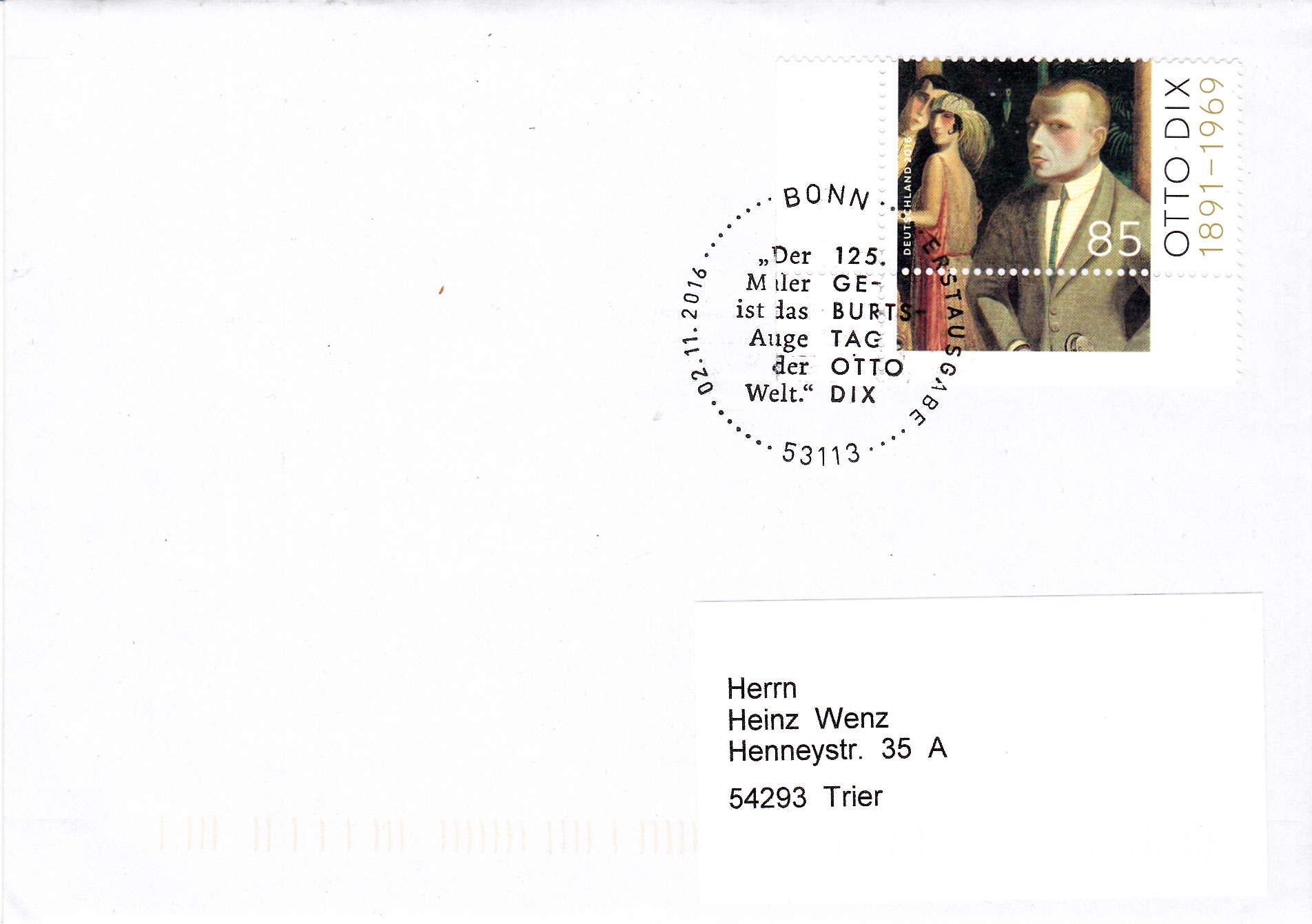 Ersttagsbrief mit der Marke zum 125. Geburtstag von Otto Dix und den Ersttagsonderstempel Bonn.