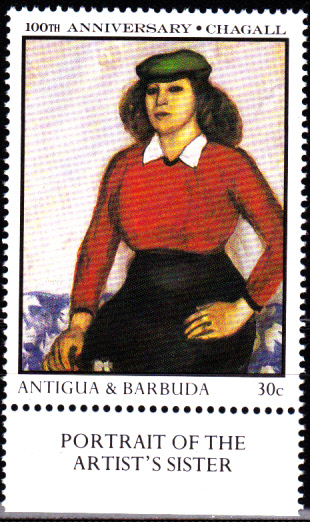 Der Wert zu 30c (MiNr 1026) der in Antigua und Barbuda erschienenen Serie zum 100. Geburtstag von Marc Chagall bildet das Porträt "Die Schwester des Künstlers". Beim gezeigten Unterrandstück ist der Name des Werks auf dem Bogenrand zu lesen.