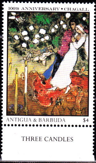 Auf der Marke zu 4$ (MiNr 1032) der in Antigua und Barbuda erschienenen Serie zum 100. Geburtstag von Marc Chagall sehen wir "Drei Kerzen". Beim gezeigten Unterrandstück ist der Name des Werks auf dem Bogenrand zu lesen.