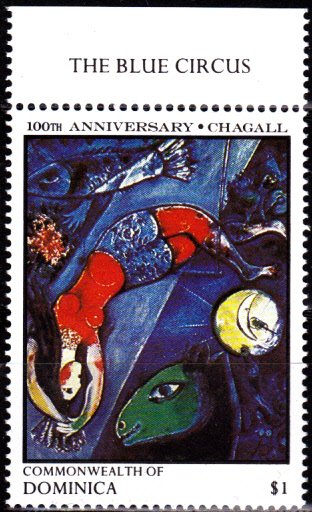 Auf dem Wert zu 1$ aus der Serie zum 100. Geburtstag von Marc Chagall aus Dominica (MiNr. 1027) ist das Werk "Der blaue Zirkus" zu sehen. Beim hier gezeigten Oberrandstück ist der Name des Bildes in Englisch auf dem Bogenrand zu lesen.