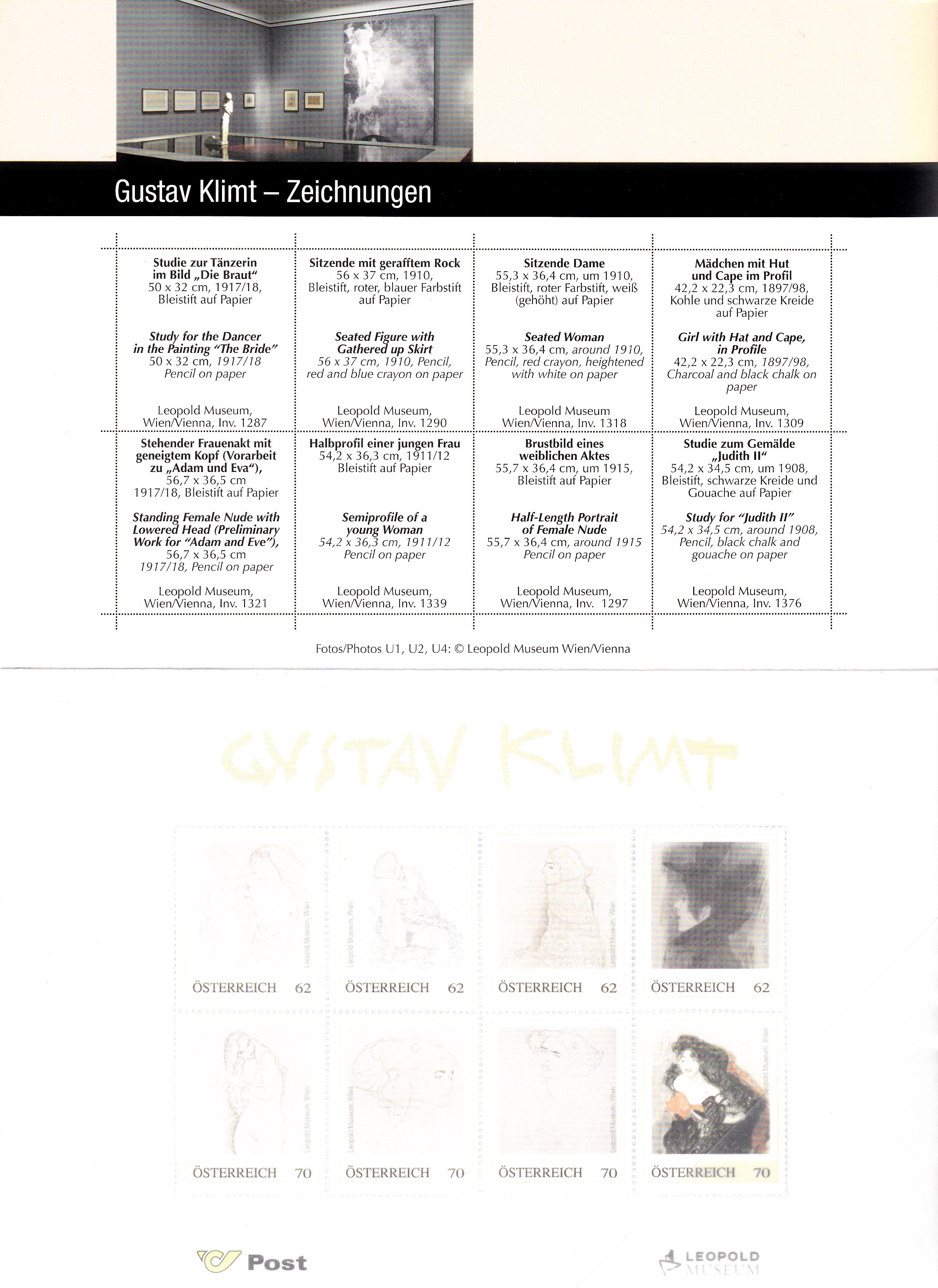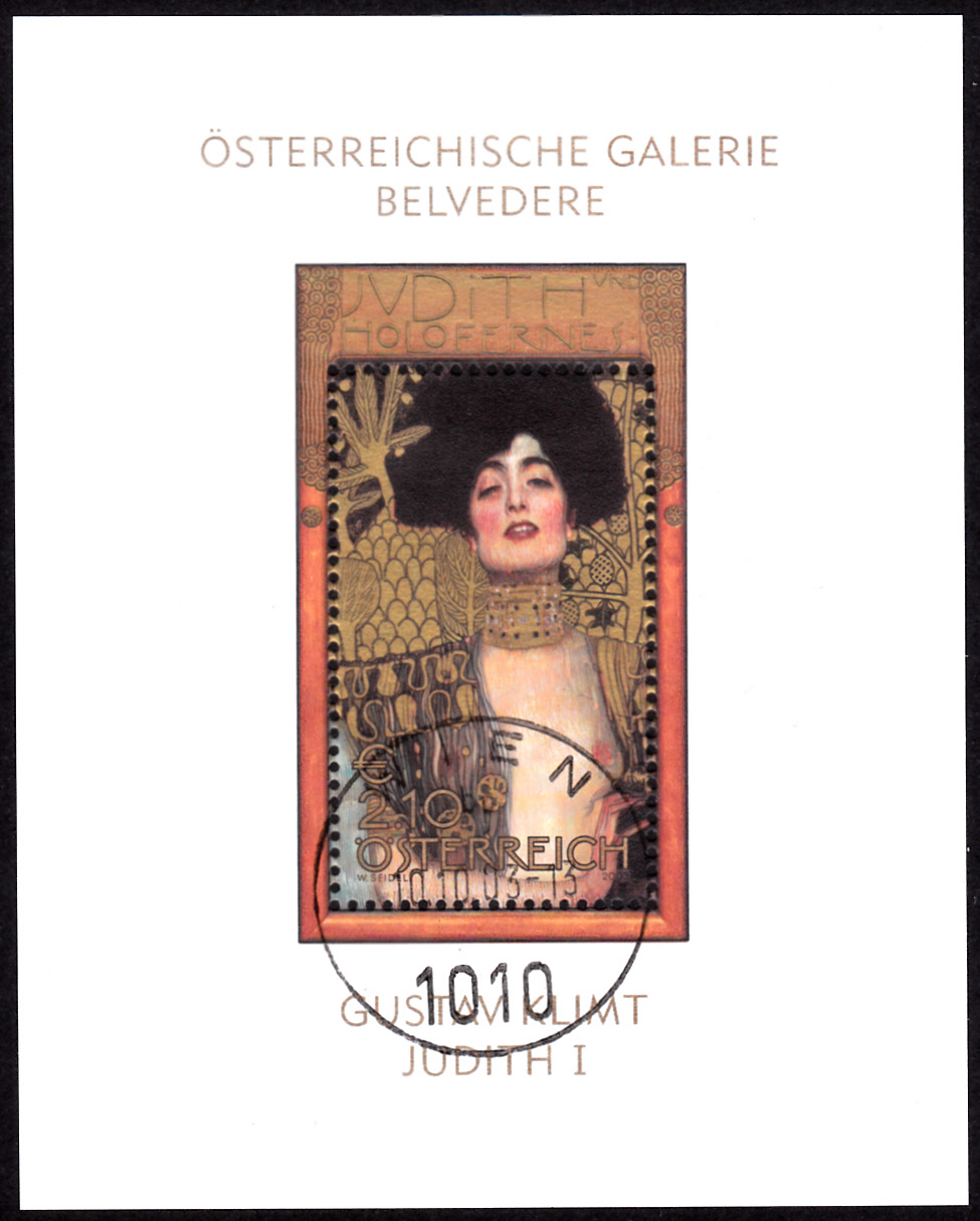 Aus Österreich kommt dieser Block (MiNr Block 22) mit einer Marke (MiNr 2449) zum Thema "Gemälde aus österreichischen Sammlungen" Die Marken zeigt das Gemälde "Judith I" von Gustav Klimt.