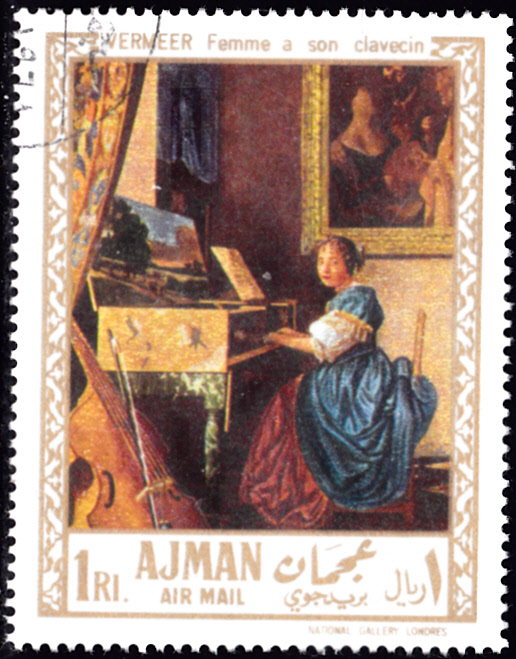 Diese Marke aus Ajman (MiNr 228 A) zeigt ein das Gemälde "Dame am Spinett" von Jan Vermeer van Delft. Es befindet sich in der National Gallery in London.