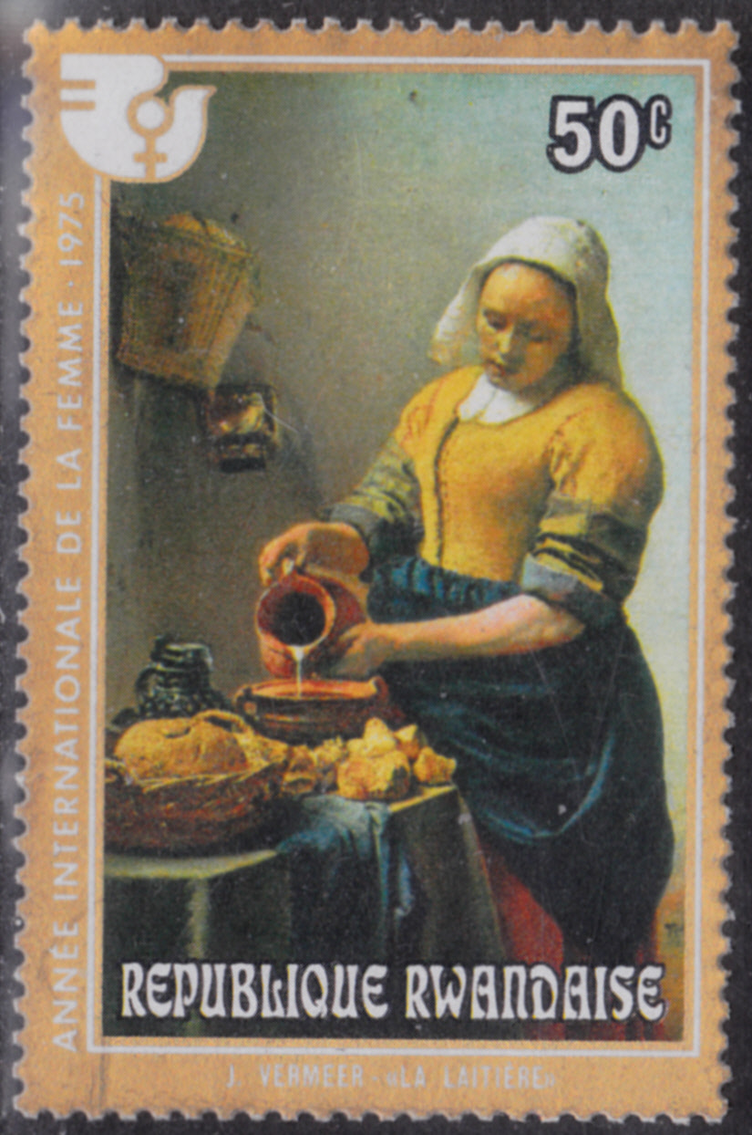 Eine Marke aus Ruanda (MiNr 726 A) aus der Serie "Internationales Jahr der Frau" zeigt das Gemälde "Das Michmädchen" von Jan Vermeer van Delft.