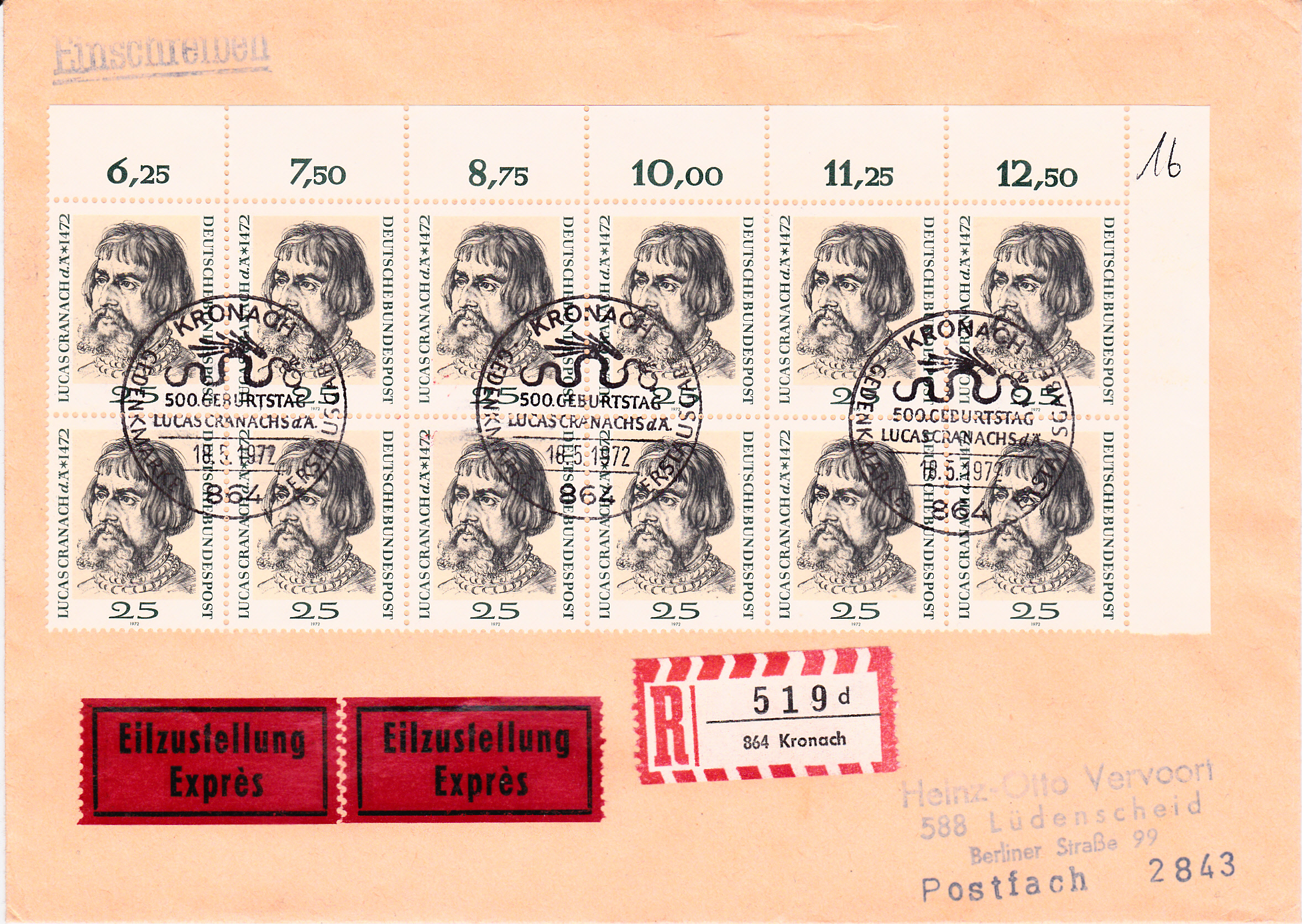 Dieser Brief mit zwölf Marken "500. Geburtstag von Lucas Cranach d. Ä." (MiNr 718) wurde in Bonn mit dem Ersttagsonderstempel gestempelt. Das Porto betrug für den Brief bis 50g 50Pf, für die Zusatzleistungen Einschreiben 100Pf und Eilzustellung 150Pf, zusammen also 300Pf.