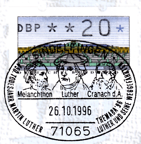 Der im vor-vorherigen Beitrag gezeigte Sonderstempel mit den Porträts von Melanchthon, Luther und Lucas Cranach dem Älteren wurde auch am 26.10.1996 eingesetzt, wie dieser Stempelabschlag zeigt.