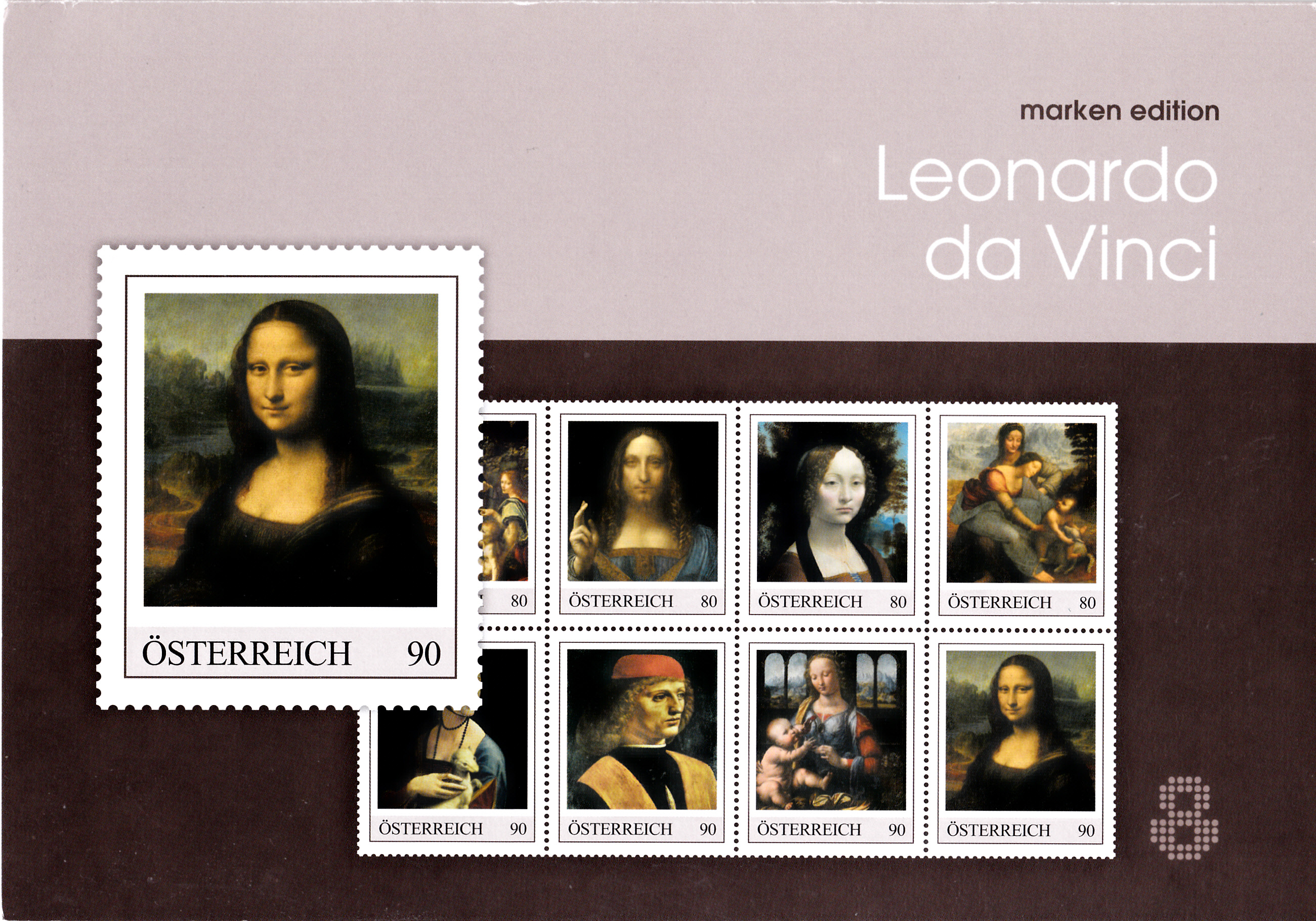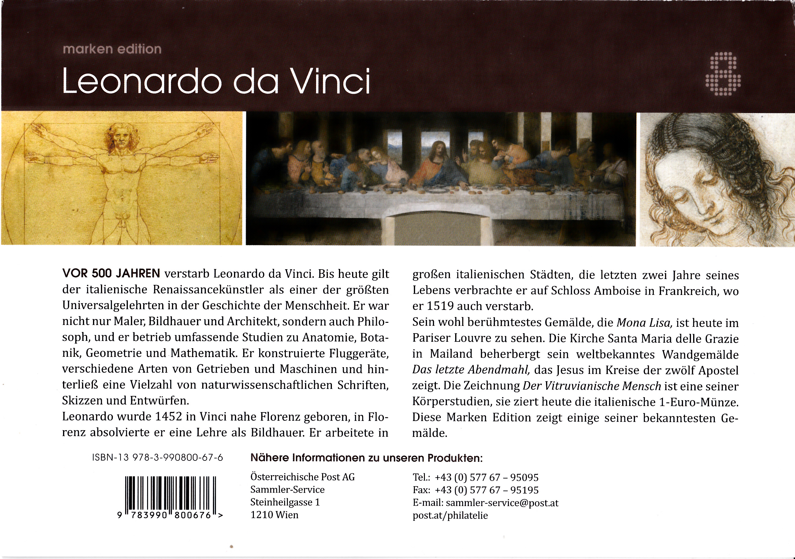 Die Marke gehört zwar zu den "Marken auf Privatbestellung" wurde aber von der Post selbst in einer Mappe mit dem Titel "Leonardo da Vinci" hergestellt und verkauft.